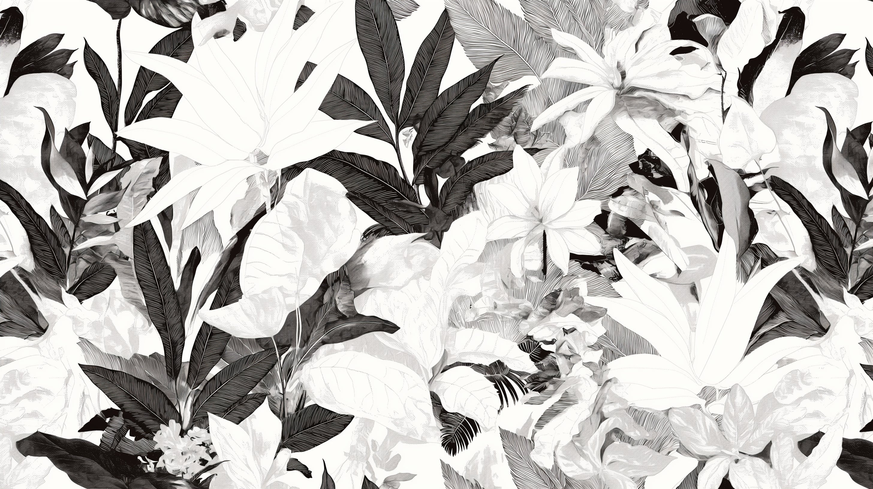 Diese tropische botanische Tapete zeigt eine künstlerisch gestaltete Komposition exotischer Blätter in einer auffälligen monochromen Farbpalette. Die meisterhaft detaillierte Illustration zeigt kräftige Palmenblätter und tropische Blüten, dargestellt in dramatischen Schwarz- und klaren Weißtönen. Jedes Blatt und jede Blüte ist sorgfältig mit feinen Linienzeichnungen versehen, wodurch ein komplexes schwarz-weißes Blumenwandbild entsteht, das Aufmerksamkeit erregt und gleichzeitig eine elegante Raffinesse bewahrt.