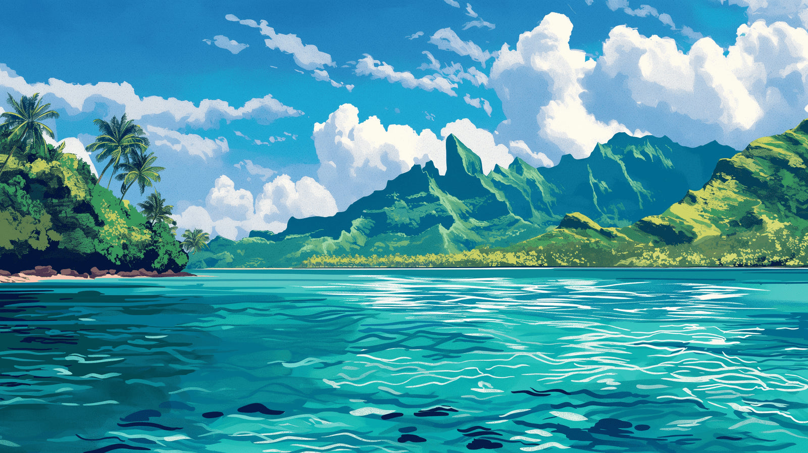 Diese tropische Landschaftstapete fängt das Wesen eines Inselparadieses mit majestätischen Bergen ein, die über einer kristallklaren türkisfarbenen Lagune aufragen. Die künstlerische Komposition zeigt hoch aufragende Gipfel in sattem Smaragdgrün vor einem lebendigen blauen Himmel, der mit aufquellenden weißen Wolken gesprenkelt ist. Die Bergsee-Tapete erzeugt durch ihre meisterhafte Darstellung von Sonnenlicht, das über die welligen Wasser tanzt, ein Gefühl von Tiefe, während üppige tropische Vegetation die malerische Aussicht einrahmt.