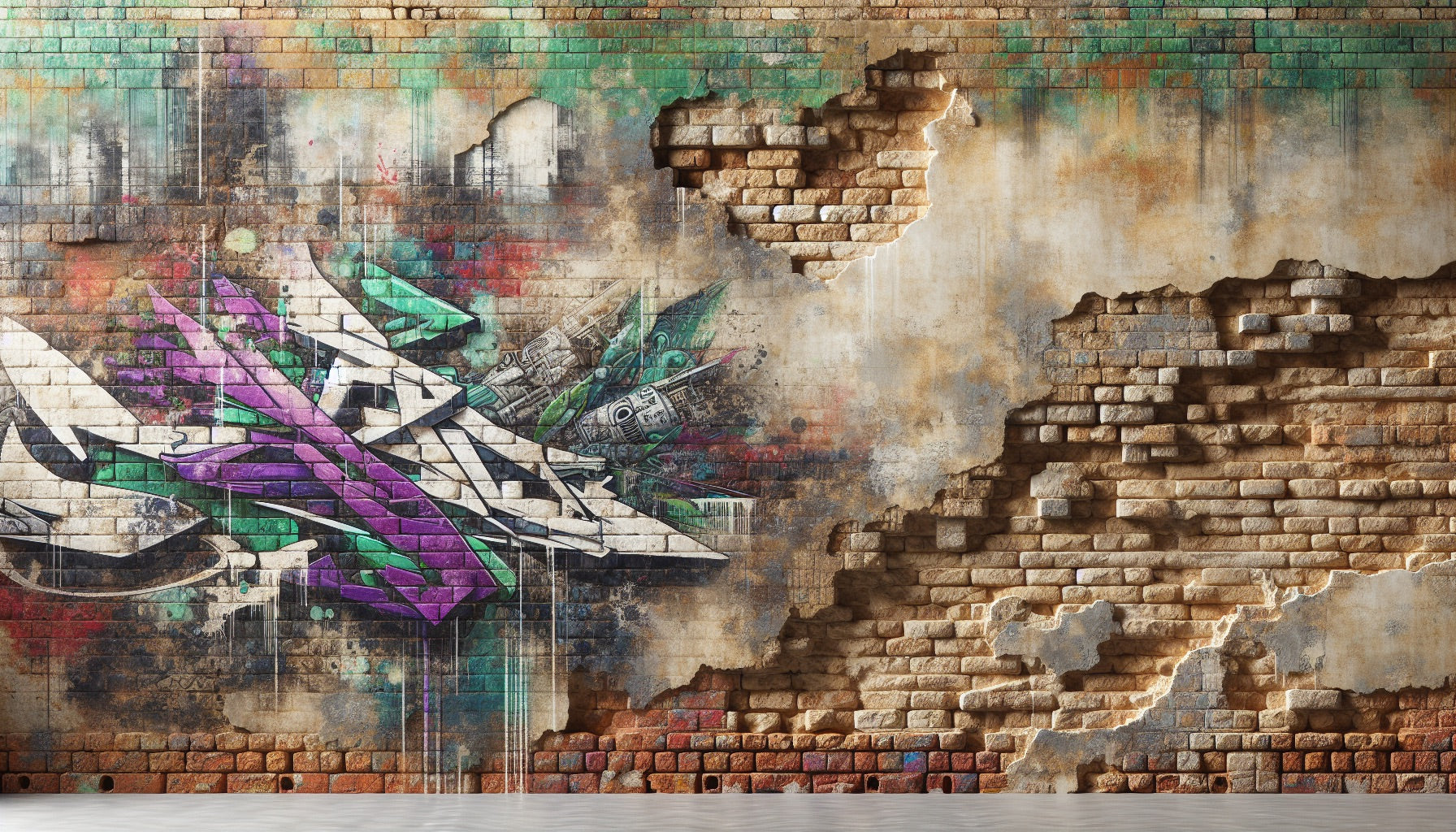 Diese urbanen Ziegel-Tapete verbindet meisterhaft rohen industriellen Charme mit zeitgenössischer Straßenkunst. Die verwitterte Ziegelfassade zeigt authentischen Verfall mit freiliegenden Schichten und natürlichen Erosionsmustern, während kühne Graffiti-Kunst in auffälligen Lila-, Smaragd- und Weißtönen einen dynamischen Blickfang schafft. Das Graffiti-Wandbild zeigt abstrakte geometrische Designs, die scheinbar aus der beschädigten Oberfläche hervortreten, verstärkt durch künstlerische Tropfen und verblasste Ränder, die Tiefe und Authentizität hinzufügen.