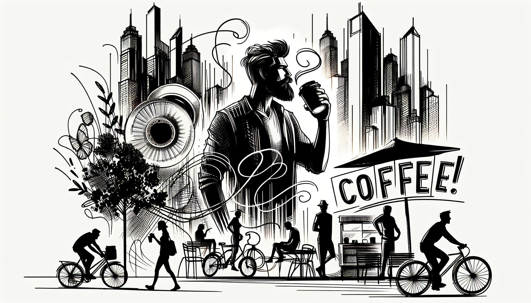 Diese urban street art tapete fängt den lebendigen Puls des Stadtlebens durch eindrucksvolle schwarz-weiße Illustrationen ein. Die dramatische Stadtsilhouette zeigt hoch aufragende Wolkenkratzer als Hintergrund für eine zentrale Figur, die ihren Kaffee genießt, während künstlerische Elemente wie dekorative Wirbel und botanische Motive dynamischen Schwung verleihen. Die moderne Stadt tapete kombiniert mutiges grafisches Design mit sorgfältiger Linienarbeit und schafft eine kraftvolle visuelle Erzählung, die die urbane Kaffeekultur feiert.