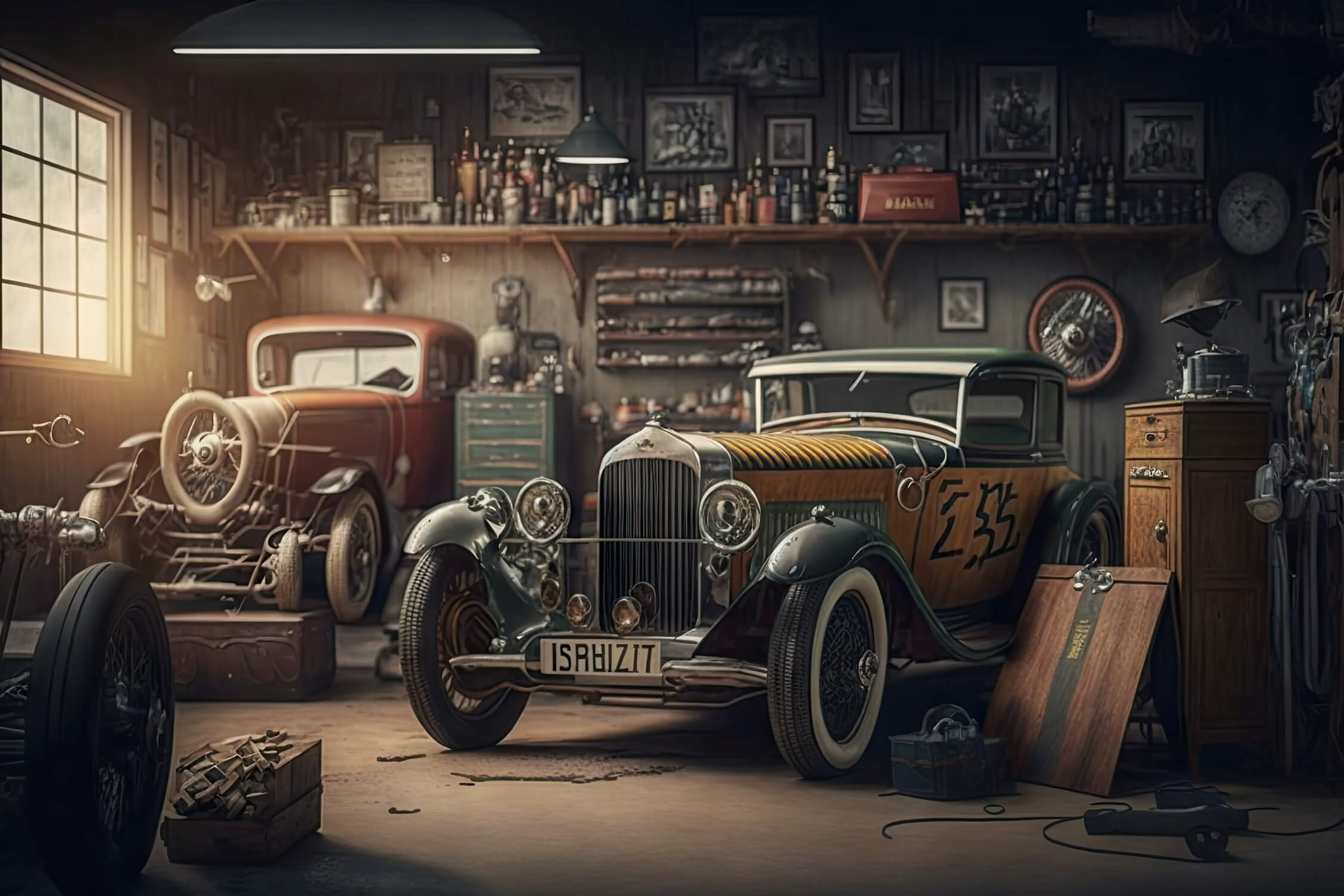 Diese Vintage-Auto-Tapete versetzt Betrachter in eine authentische klassische Garagenwerkstatt, in der wunderschön erhaltene Automobile in atmosphärischem Glanz ruhen. Die reichen Sepiatöne und das stimmungsvolle Licht schaffen Tiefe und Dimension, während sorgfältig dargestellte Details historischer Fahrzeuge, darunter ein auffälliges nummeriertes Rennwagen und ein klassischer roter Coupé, die Retro-Automobil-Tapete in ihrer vollen Pracht zeigen. Die Vielzahl an Vintage-Werkzeugen, Flaschen und gerahmten Kunstwerken an den Wänden verleiht dieser nostalgischen Szene authentischen Charakter.