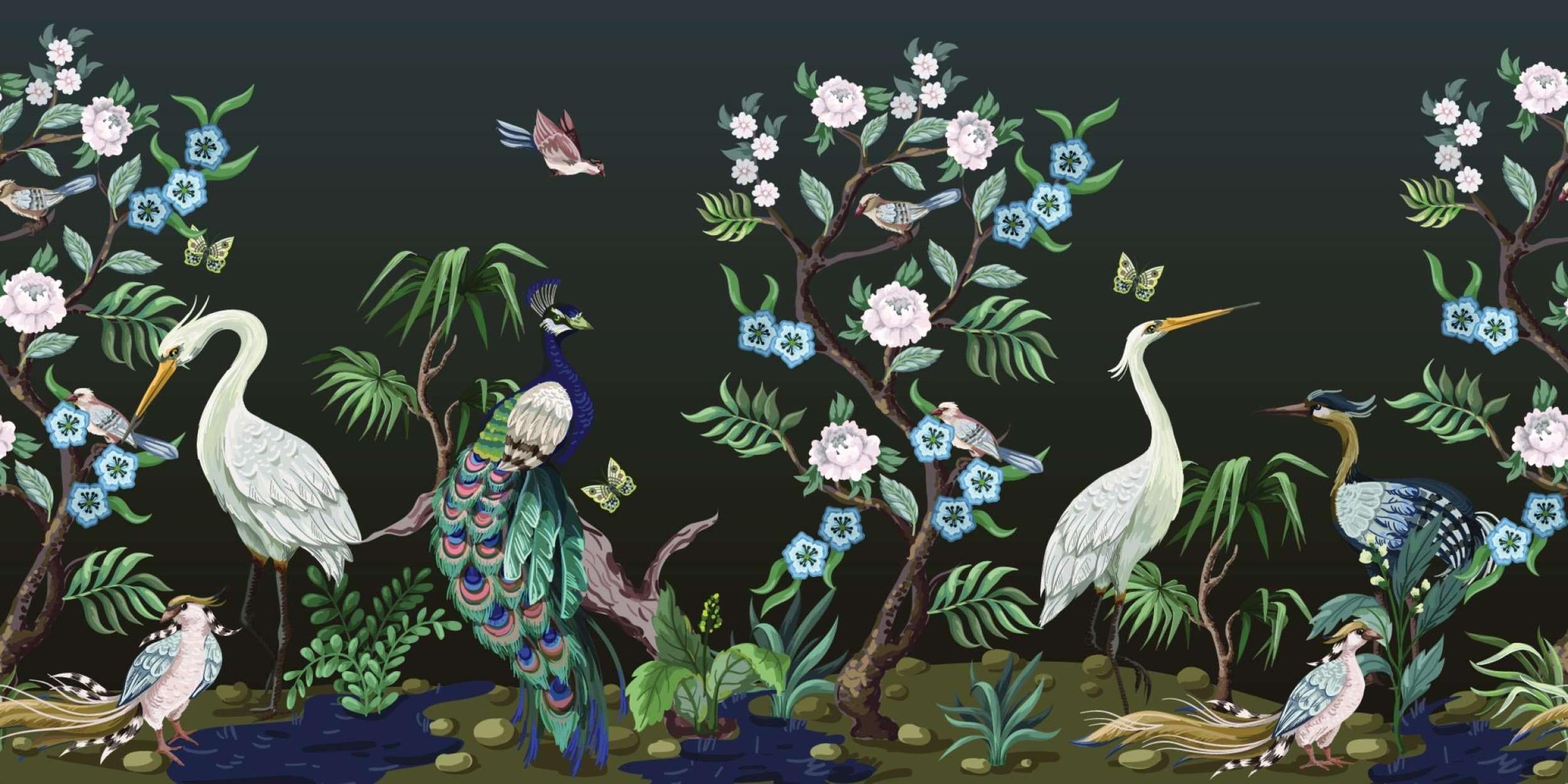 Vögel Tapete | Eleganter Pfau und Reiher Garten