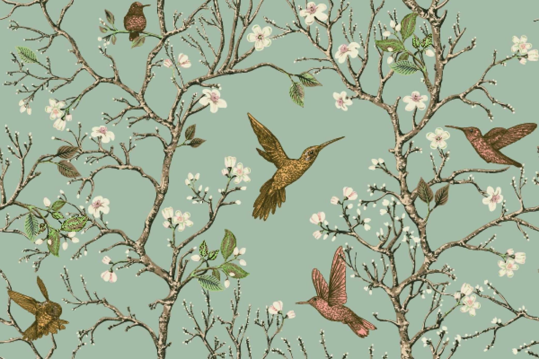 Dieses Vogel-Tapeten-Mural fängt den bezaubernden Tanz goldener Kolibris zwischen zarten Kirschblüten auf einem sanften salbeigrünen Hintergrund ein. Meisterhaft detaillierte Äste erstrecken sich über die Wand, geschmückt mit makellosen weißen Blüten, die von dezenten rosa Zentren berührt werden. Die florale Vogel-Tapete zeigt fachmännisch dargestellte Kolibris in reichen Kupfer- und Goldtönen und schafft ein anspruchsvolles Zusammenspiel der anmutigsten Elemente der Natur.
