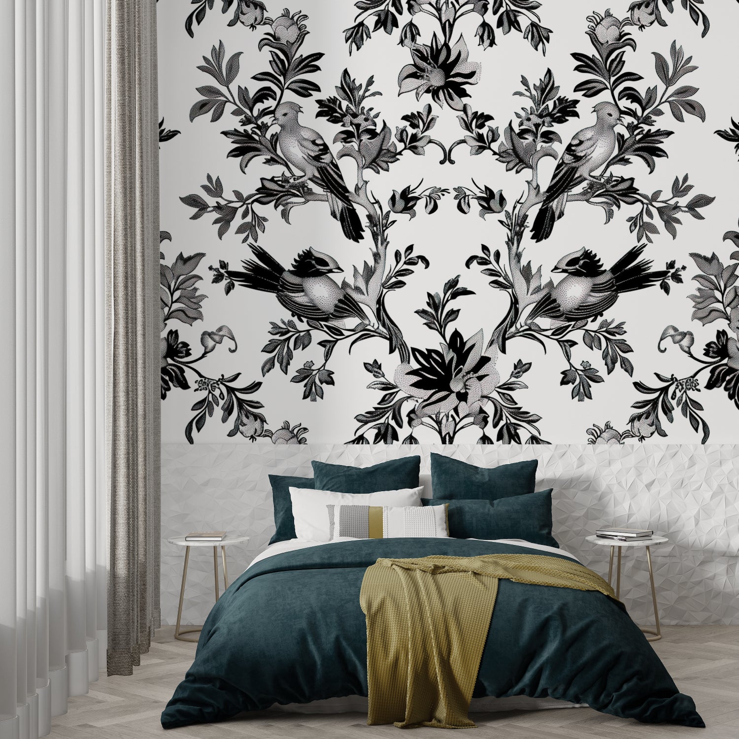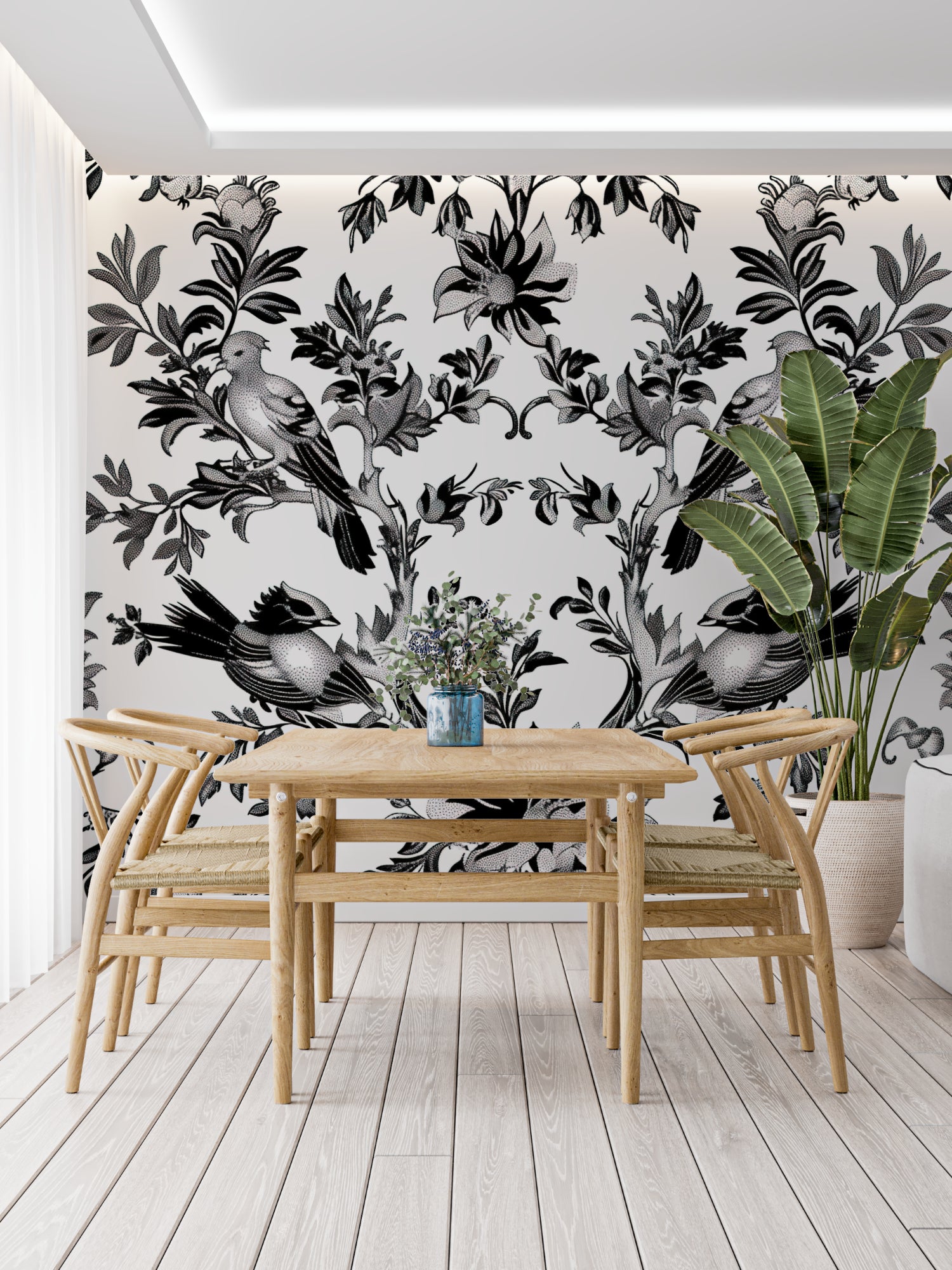 Diese schwarz-weiße Vogel-Tapete bringt reine Eleganz an Ihre Wände.