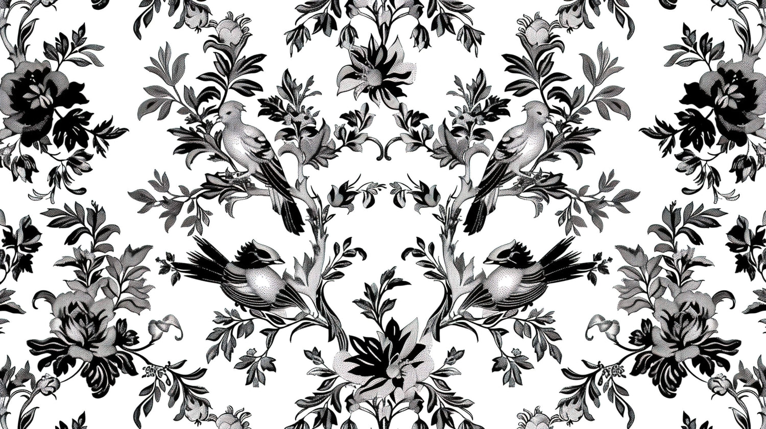 Diese botanische Vogel-Tapete zeigt ein elegantes Schwarz-Weiß-Design, inspiriert von klassischen Toile de Jouy-Mustern. Anmutige Vögel sitzen zwischen kunstvoll detailliertem Laub und schaffen eine anspruchsvolle symmetrische Komposition vor einem klaren weißen Hintergrund. Die monochrome Vogel-Tapete verbindet zarte botanische Illustrationen mit dramatischen Vogelmotiven und bietet eine perfekte Balance zwischen klassischer Kunstfertigkeit und zeitgenössischem Stil.