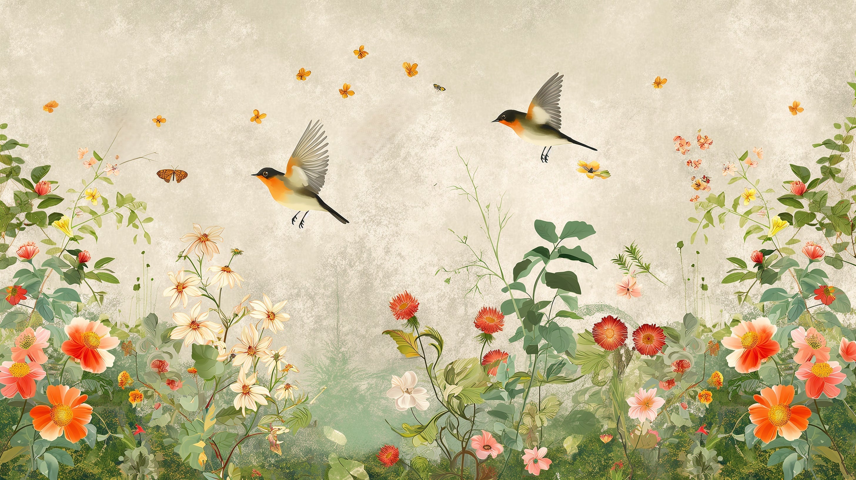 Diese Tapete mit Gartenvögeln fängt den bezaubernden Tanz der Rotkehlchen inmitten einer blühenden Wildblumenwiese ein. Vor einem sanften beigen Hintergrund schweben orangebrüstige Vögel anmutig durch die Luft, während zarte Schmetterlinge zwischen blühenden Korallen-, Creme- und Scharlachblumen flattern. Die florale Vogeltapete zeigt üppiges grünes Laub und detaillierte botanische Elemente und schafft eine harmonische Komposition, die die Außenwelt ins Innere bringt.