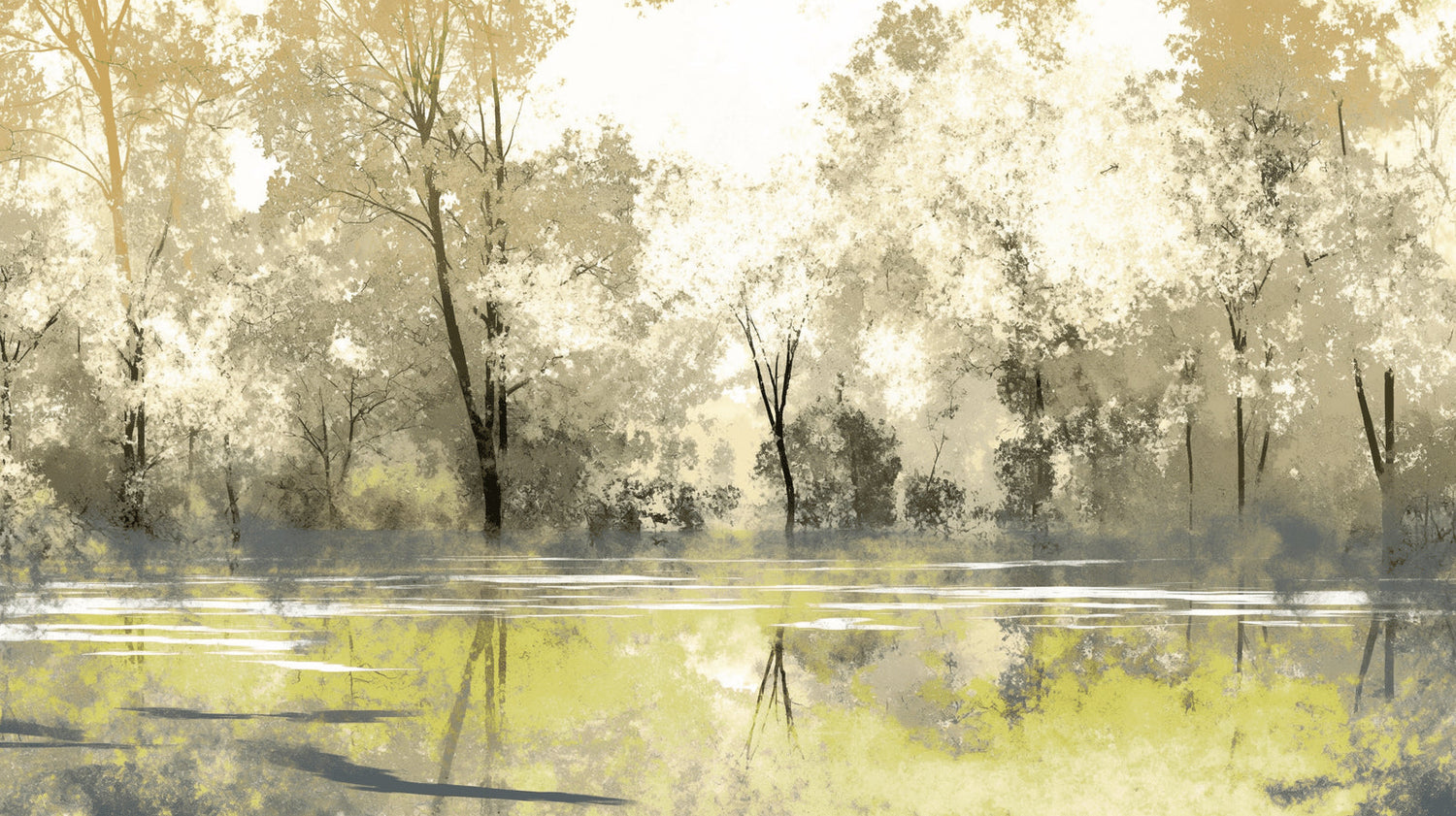 Diese Waldlandschafts-Tapete schafft eine ätherische Aussicht, bei der goldfarbene Bäume durch einen sanften Morgennebel hervortreten. Die künstlerische Komposition fängt eine ruhige Seeszene ein, bei der majestätische Bäume ihre Spiegelbilder auf stilles Wasser werfen und so einen spiegelähnlichen Effekt erzeugen. In raffinierten Beige- und Goldtönen mit dezenten Akzenten in Salbeigrün gehalten, zeigt dieses Natur-Wandbild außergewöhnliche Tiefe und atmosphärische Perspektive.