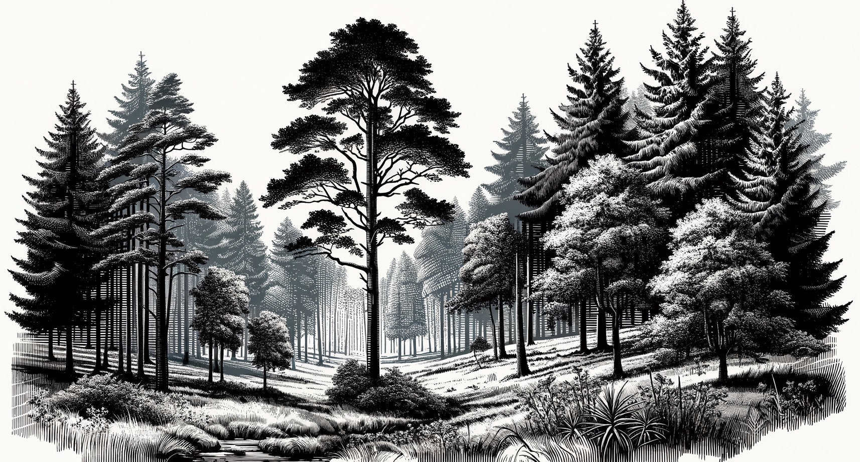 Dieses Waldtapeten-Mural fängt die majestätische Schönheit hoch aufragender Kiefern in eindrucksvollen monochromen Details ein. Das Herzstück zeigt die markante Silhouette einer Kiefer, deren Äste sich anmutig über den nebligen Hintergrund erstrecken, während Fichten und Tannen in verschiedenen Grautönen Schichten von Tiefe schaffen. Die schwarz-weiße Baumtapete präsentiert filigrane botanische Illustrationen mit bemerkenswerter Präzision, von der strukturierten Rinde bis zum zarten Nadelwerk.