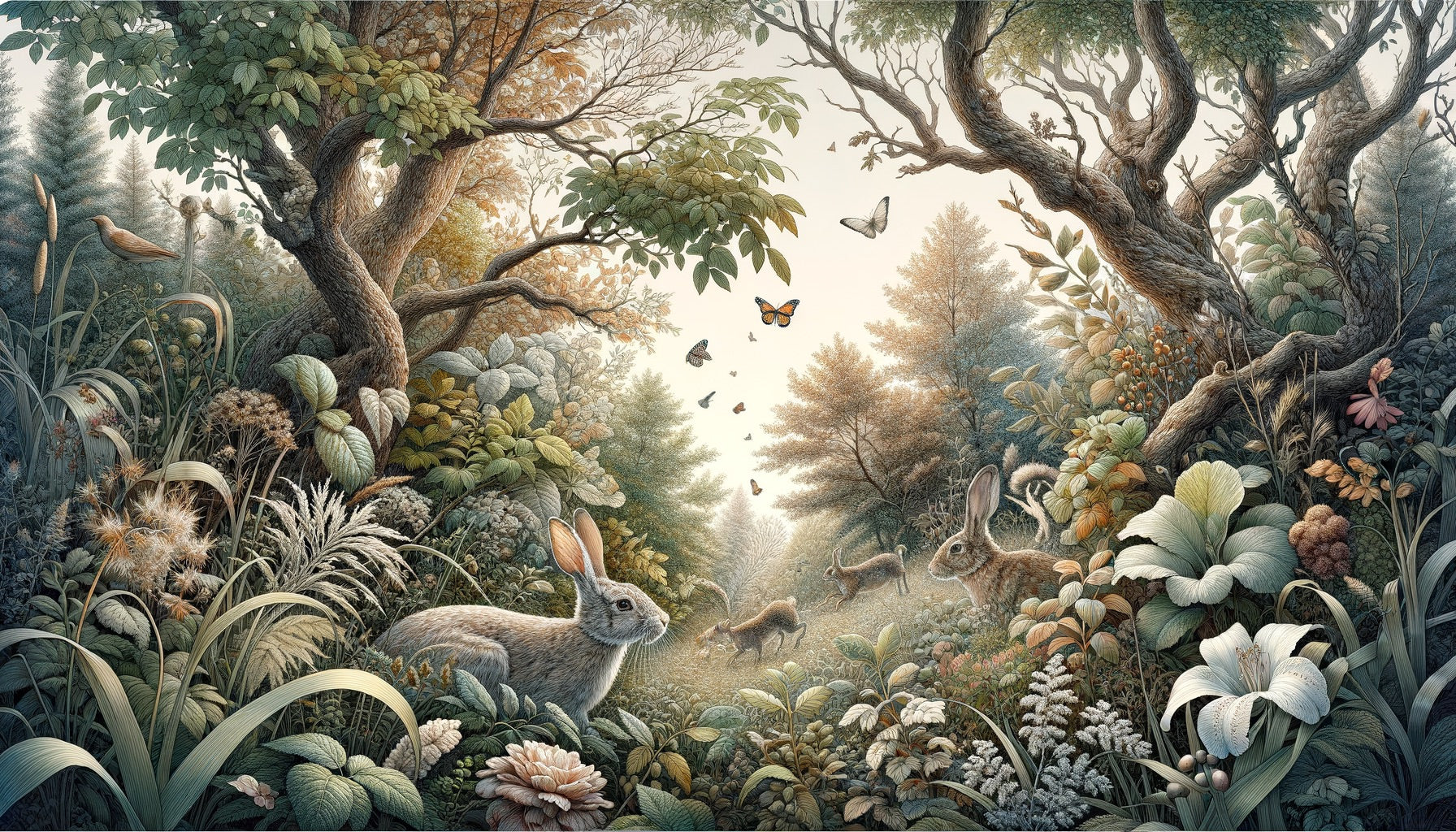 Dieses Waldtapeten-Mural fängt die ruhige Schönheit einer mystischen Waldszene ein, in der verdrehte Bäume einen nebligen Pfad umrahmen, der mit tanzenden Schmetterlingen geschmückt ist. Die reiche Farbpalette kombiniert tiefes Waldgrün mit subtilen Erdtönen, während zarte Blätter und breitblättrige Pflanzen Schichten natürlicher Textur schaffen. Versteckt in diesem Waldtapeten-Mural blickt ein sanftes Kaninchen aus dem üppigen Unterholz hervor und verleiht der anspruchsvollen botanischen Illustration einen Hauch von Verspieltheit.