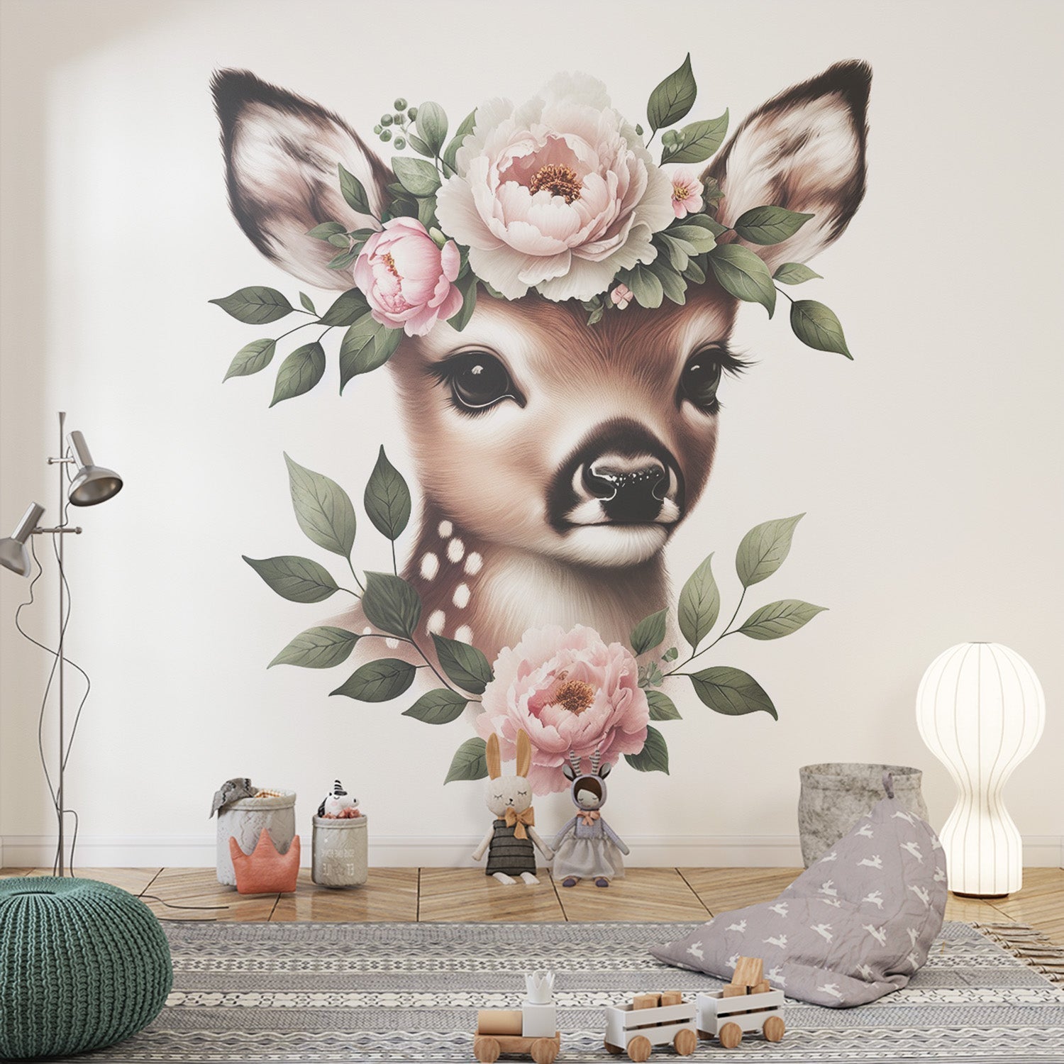 Der sanfte Hirsch und die zarten rosa Pfingstrosen schaffen einen beruhigenden Raum für die Kleinen.