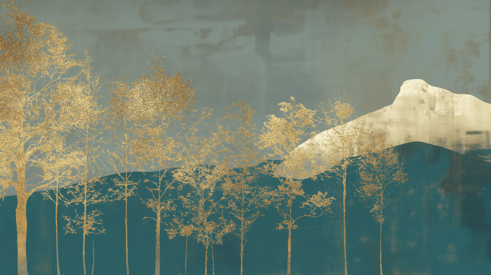Diese luxuriöse Waldtapete fängt die ätherische Schönheit goldener Bäume vor einem eleganten türkisgrünen Hintergrund ein. Die zarten Zweige schimmern mit metallischem Glanz, während eine abstrakte Bergsilhouette in Cremetönen eine beeindruckende Tiefenwirkung erzeugt. Jedes Element der goldenen Baumtapete ist sorgfältig gestaltet und verbindet künstlerische Raffinesse mit natürlicher Anmut, um eine Szene von außergewöhnlicher visueller Wirkung zu schaffen.