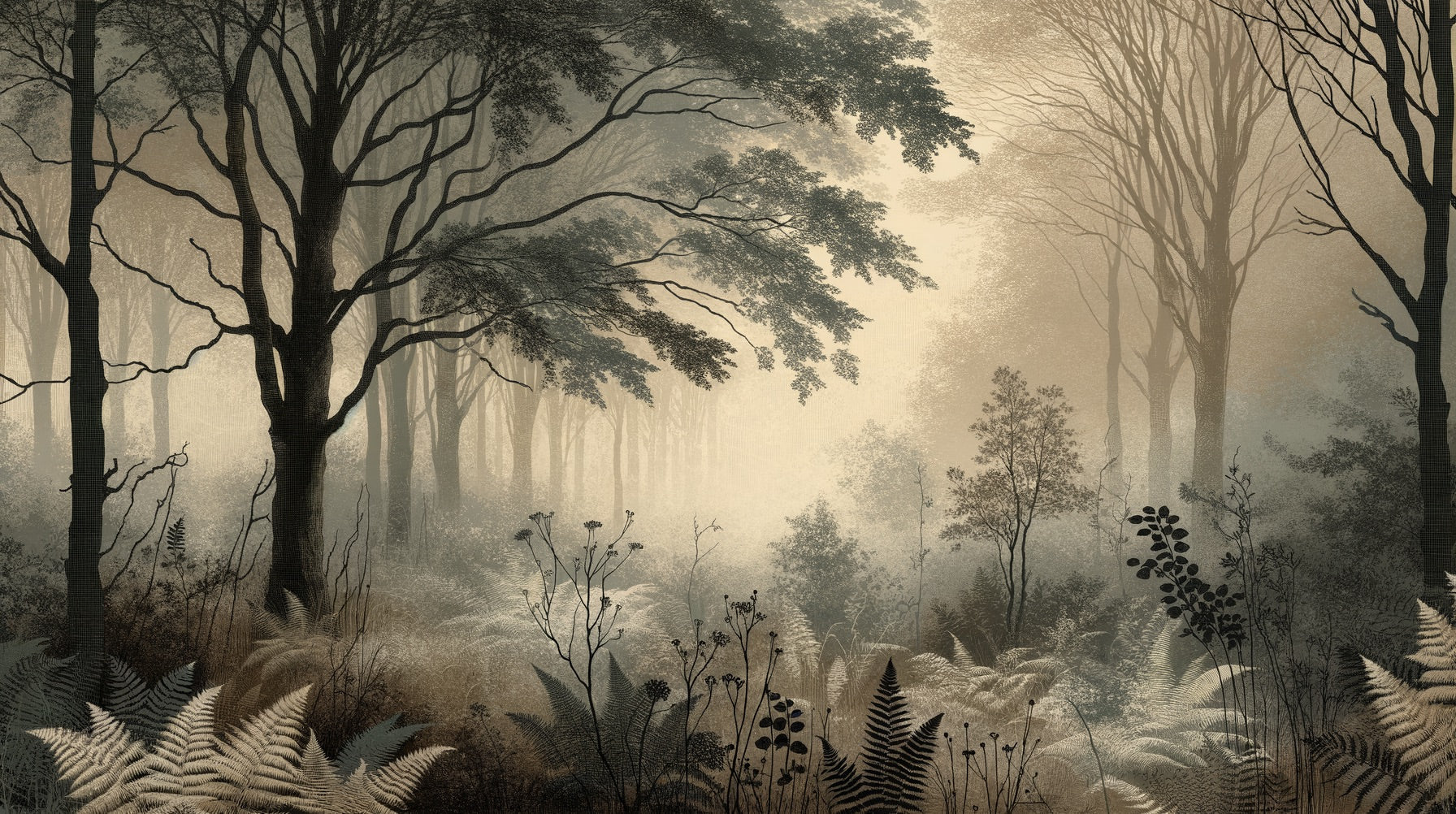 Wald Tapete | Nebelige Bäume in Sepiatönen