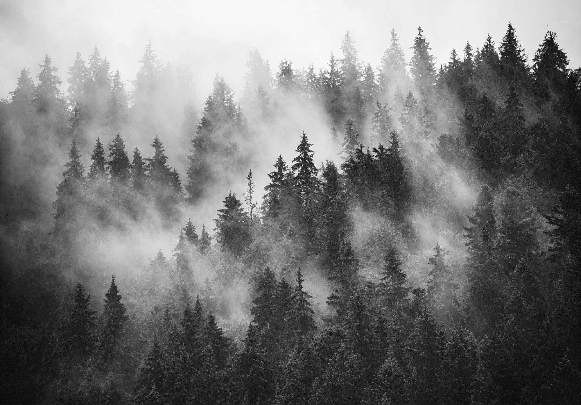 Wald Tapete | Nebelige Kiefern in Schwarz und Weiß