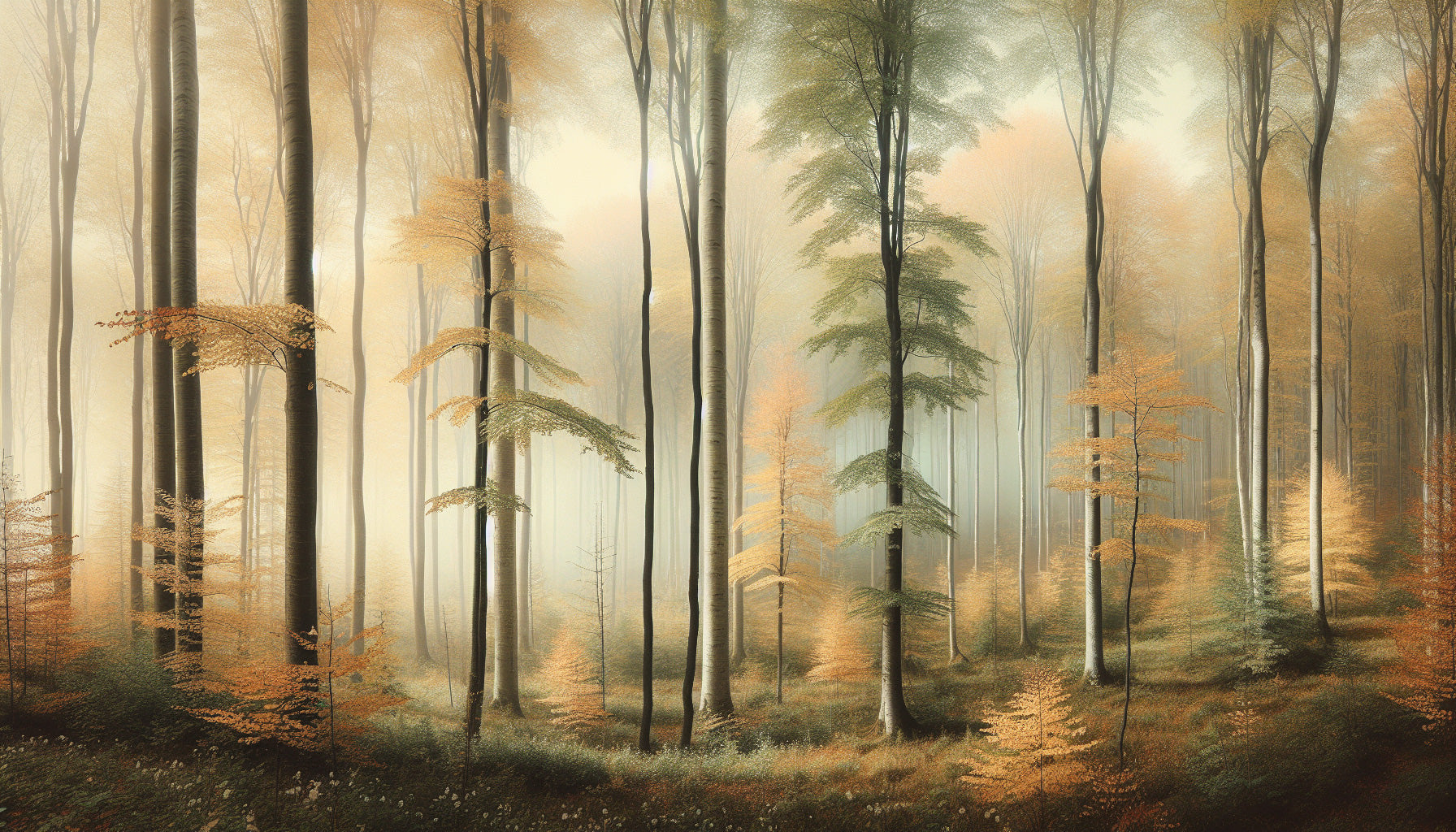 Diese Waldtapete fängt die ätherische Schönheit eines herbstlichen Waldes ein, der im goldenen Morgenlicht erstrahlt. Hohe, majestätische Baumstämme ragen durch einen sanften Nebel, während zarte Äste mit bernsteinfarbenem und salbeigrünem Laub ein faszinierendes Blätterdach schaffen. Das Zusammenspiel warmer Sepiatöne und sanfter Grüntöne verleiht dieser Waldtapete Tiefe, während der geheimnisvolle Nebel eine bezaubernde atmosphärische Qualität hinzufügt.