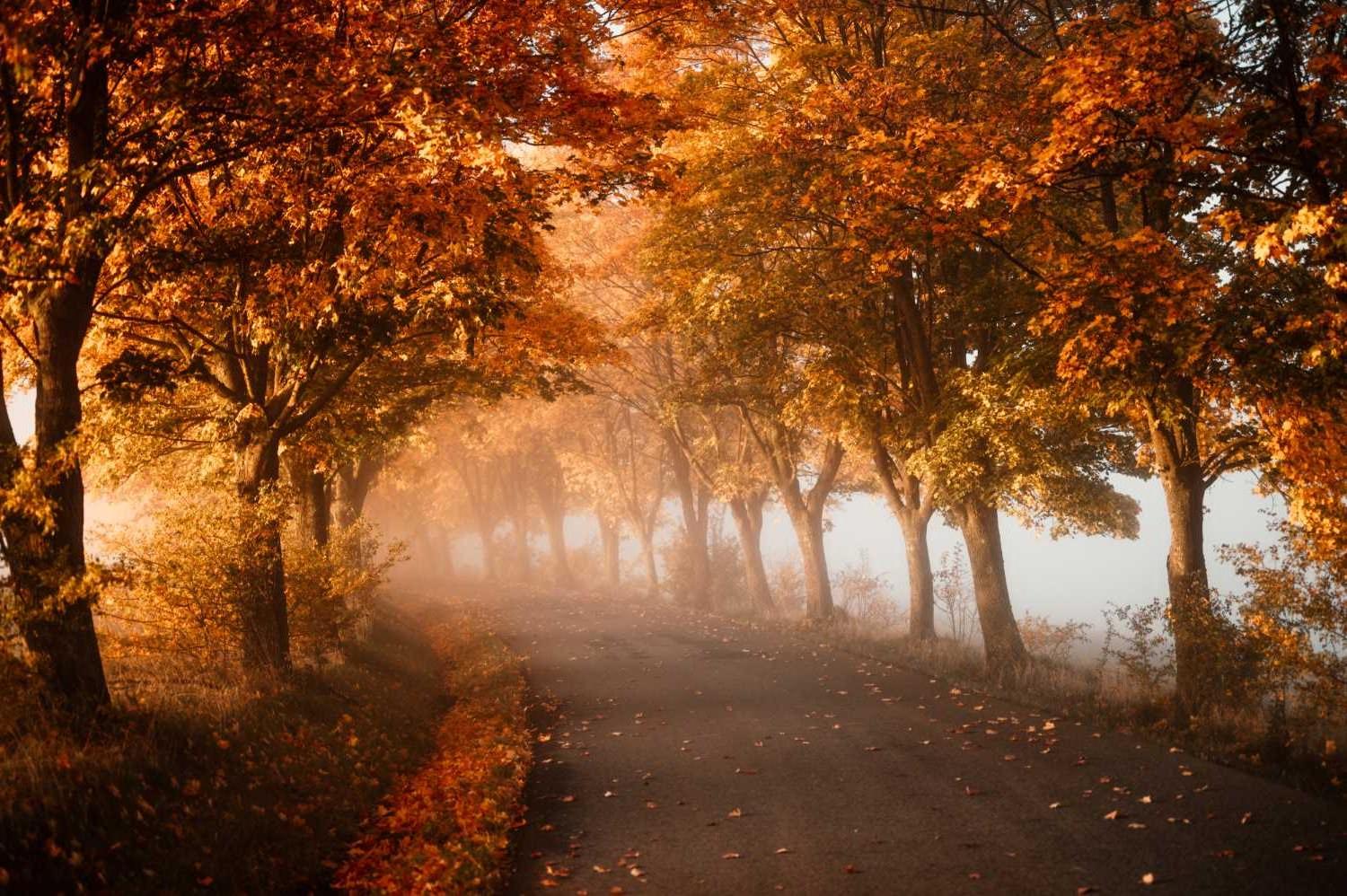 Dieses Waldtapeten-Mural fängt die bezaubernde Schönheit eines herbstlichen Pfades ein, wo goldenes Sonnenlicht durch ein Blätterdach aus rostfarbenen Blättern scheint. Die prächtige, von Bäumen gesäumte Allee bildet einen natürlichen Bogen, dessen Äste in satten Bernstein- und Terrakottatönen geschmückt sind. Morgendlicher Nebel webt sich zwischen die Stämme und verleiht diesem Naturwandmural eine ätherische Qualität, während gefallene Blätter den Weg in einer Darstellung des sanften Wandels des Herbstes bedecken.