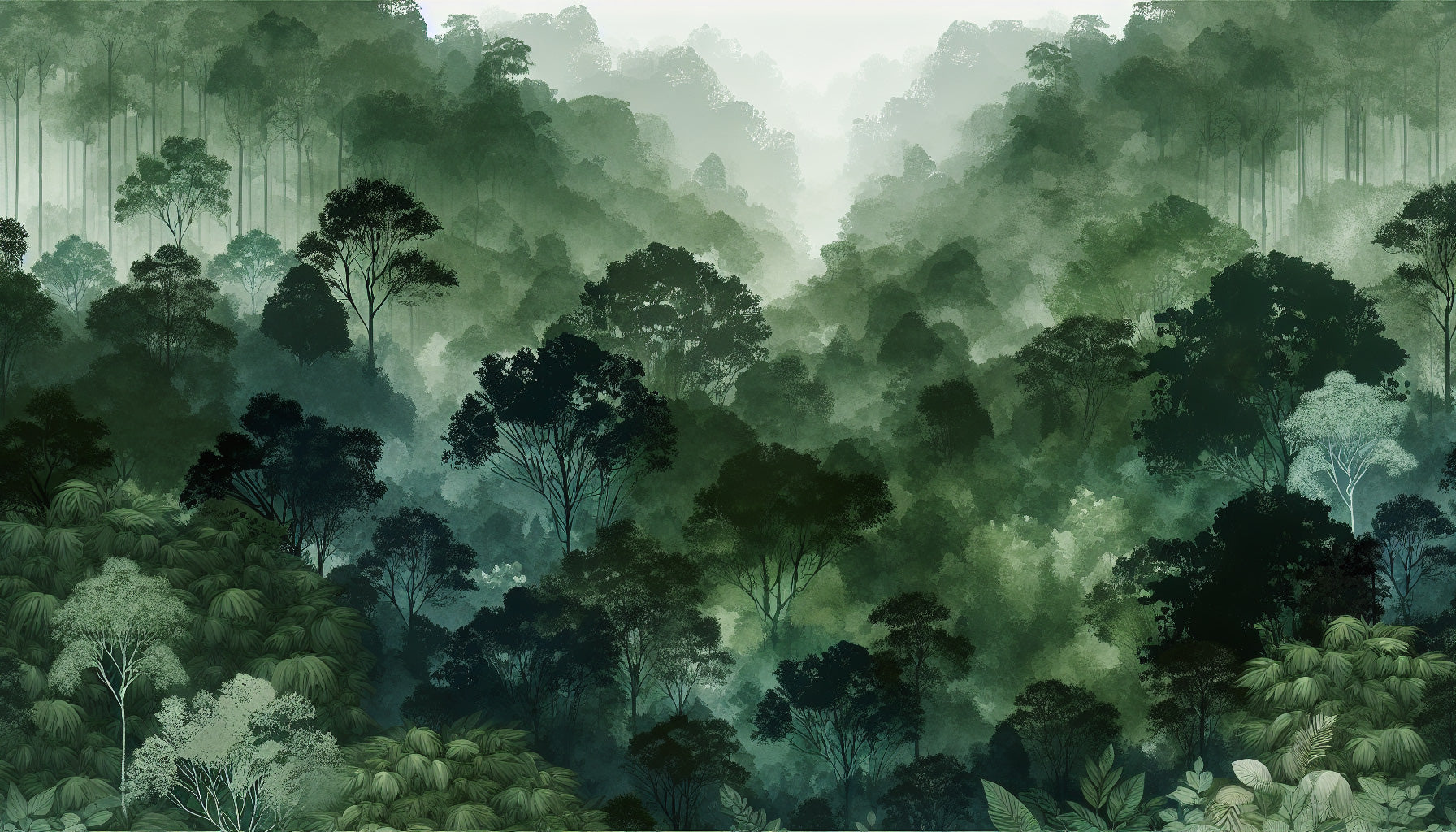 Dieses Waldtapeten-Mural fängt die ätherische Schönheit eines nebligen Waldtals ein, dargestellt in satten Smaragd- und Salbeigrüntönen. Das Aquarell-Kunstwerk zeigt hoch aufragende Bäume, die durch Schichten von Morgennebel hervortreten und ein Gefühl von Tiefe und Geheimnis erzeugen. Jede Baum-Silhouette ist meisterhaft gegen den grünen Waldhintergrund detailliert, während subtile Schattierungsvariationen das Zusammenspiel von Licht und Schatten durch das Blätterdach andeuten.