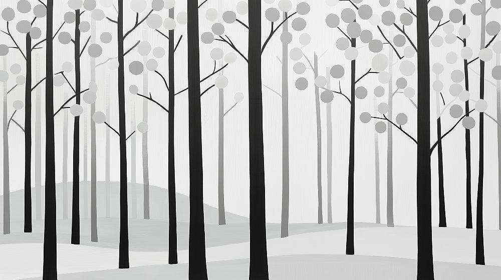 Diese minimalistische Waldtapete fängt die ruhige Schönheit eines stilisierten Waldes durch eine eindrucksvolle monochrome Linse ein. Kräftige schwarze Baumstämme erheben sich anmutig vor einem makellosen weißen Hintergrund, während zarte graue Kreise zwischen den Ästen tanzen und eine abstrakte Interpretation des Laubs schaffen. Die schwarz-weiße Baumwandmalerei verbindet geometrische Präzision mit organischen Formen und erzeugt ein rhythmisches Muster, das das Auge auf eine faszinierende visuelle Reise nach oben zieht.