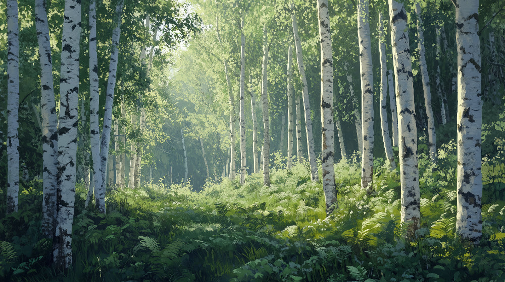 Diese Birkwald-Tapete schafft ein bezauberndes Portal zu einem ruhigen Waldrefugium. Weißrindige Birken erheben sich majestätisch vor einem Hintergrund aus sanftem, gefiltertem Sonnenlicht, während üppige grüne Farne den Waldboden bedecken. Die Waldbaum-Tapete fängt den ätherischen Morgennebel und tanzende Schatten zwischen den zarten Blättern ein und erzeugt eine meisterhafte Tiefe, die das Auge in dieses natürliche Wunderland zieht.