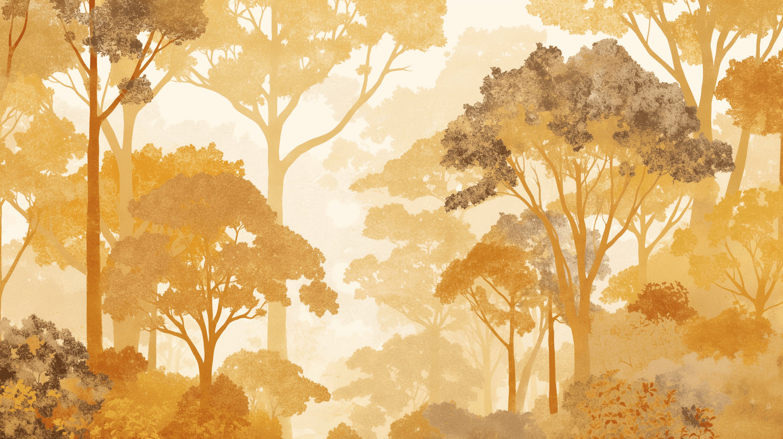 Dieses Waldtapeten-Mural fängt die ätherische Schönheit eines sonnenverwöhnten Waldes in reichen goldenen Tönen ein. Die künstlerische Komposition zeigt majestätische Baum-Silhouetten vor einem leuchtenden cremefarbenen Hintergrund und schafft Tiefe und Dimension durch Schichten warmer Bernstein- und Ockertöne. Jedes Baum-Wandbild-Element ist sorgfältig gestaltet, um die ruhige Essenz der Natur hervorzurufen, mit zarten Ästen, die in einem eleganten Tanz von Licht und Schatten himmelwärts streben.