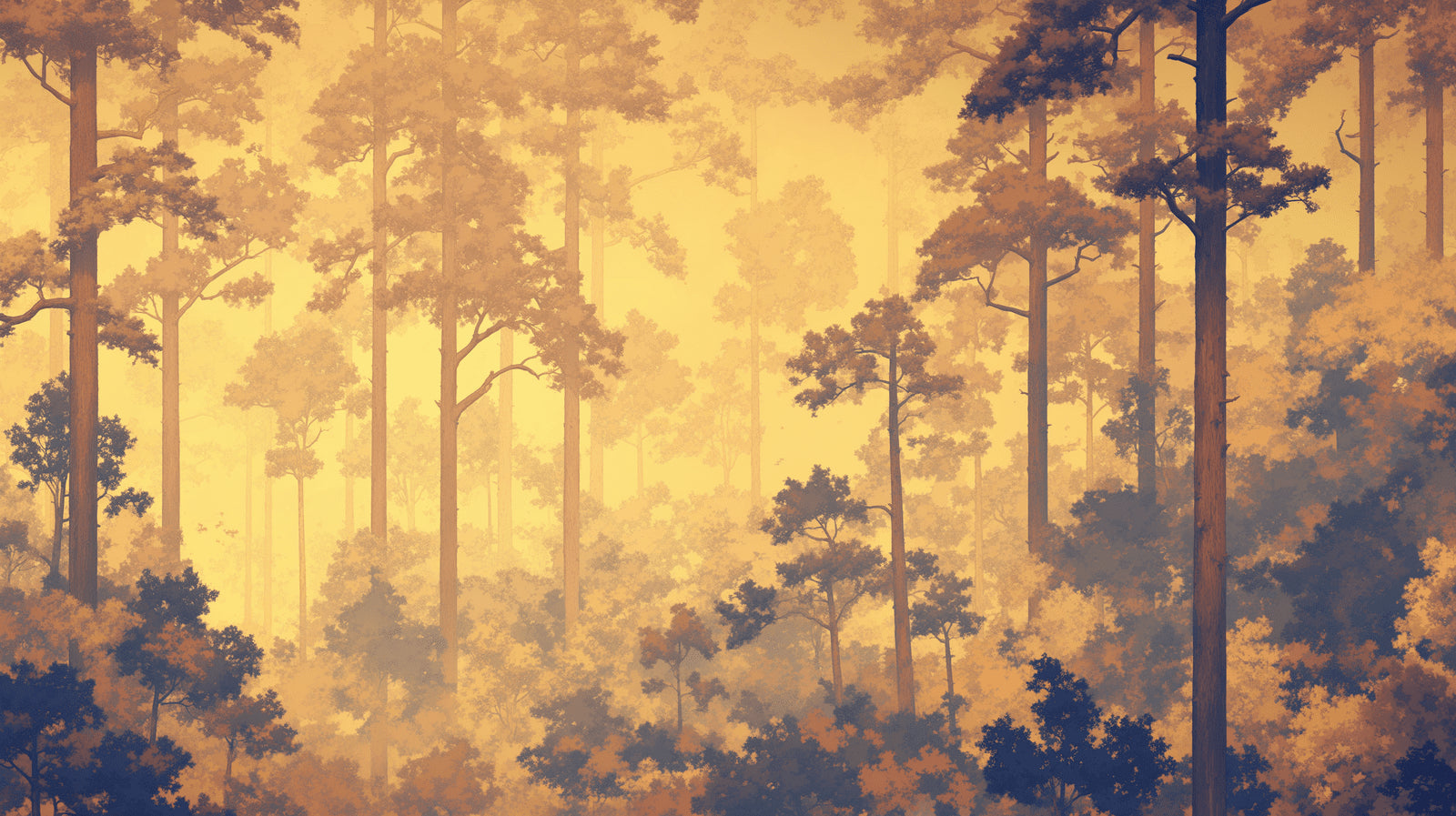 Dieses Waldtapeten-Mural fängt die ätherische Schönheit eines Kiefernwaldes ein, der in goldenes Sonnenlicht getaucht ist. Hohe Bäume ragen gegen einen leuchtenden bernsteinfarbenen Hintergrund empor, ihre Silhouetten schaffen Tiefe und Geheimnis. Das Zusammenspiel von warmen Ockertönen und tiefbraunen Schatten gestaltet ein Natur-Wandbild, das Wärme und Ruhe ausstrahlt und die magischen Momente eines Waldes bei Sonnenuntergang heraufbeschwört.