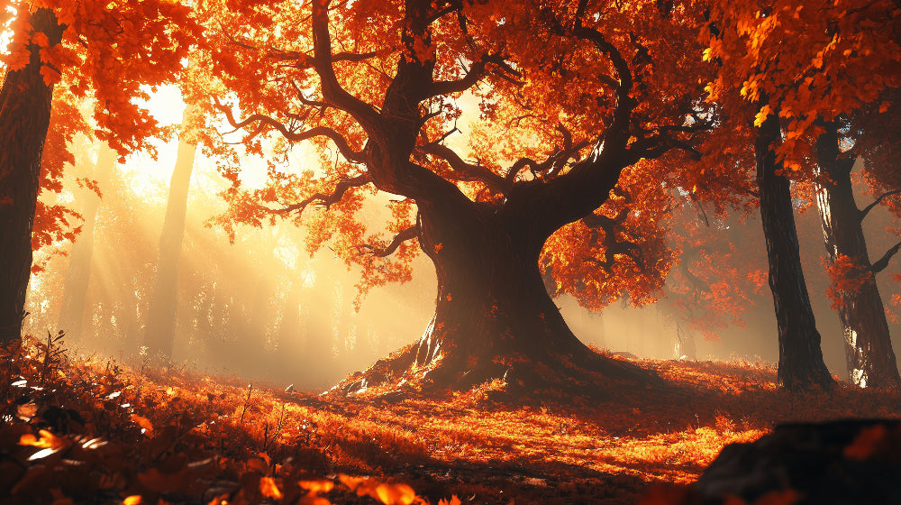 Diese Herbstwald-Tapete fängt einen atemberaubenden Moment natürlicher Majestät ein, mit einem hoch aufragenden alten Baum, dessen Äste sich über einen nebligen goldenen Himmel erstrecken. Das reiche orange-rote Laub leuchtet mit ätherischer Wärme, während Sonnenstrahlen durch den Morgennebel dringen und ein bezauberndes Spiel von Licht und Schatten schaffen. Die Baum-Wandbild-Tapete zeigt die Kunst der Natur in ihrer spektakulärsten Form, mit gefallenem Laub, das den Waldboden in warmen Bernsteinfarben bedeckt.