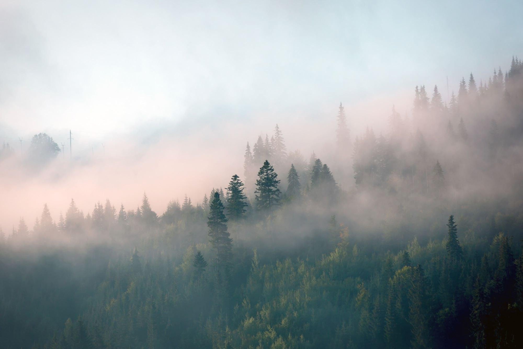 Dieses neblige Waldtapete bringt frische Bergluftstimmung nach Hause.