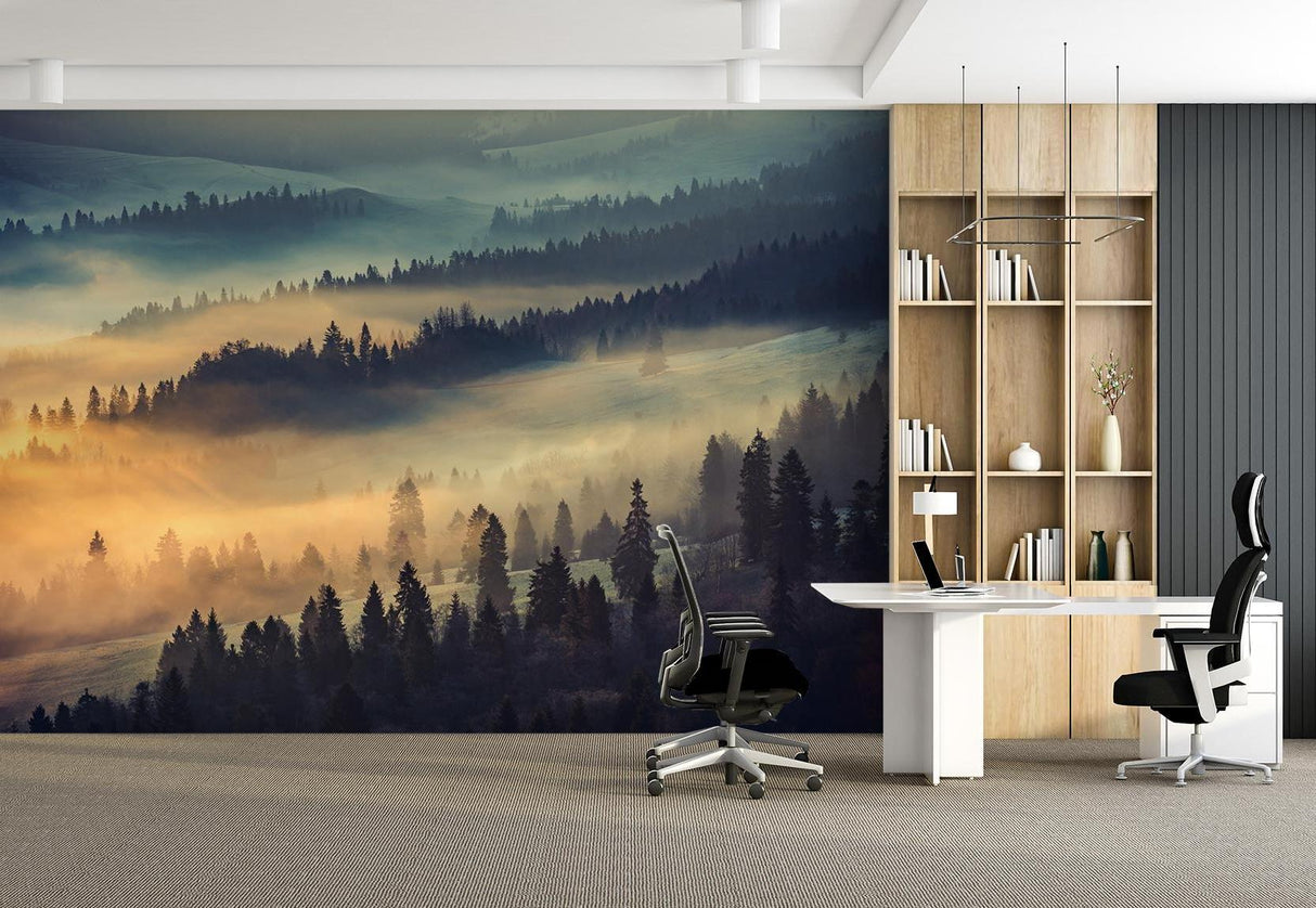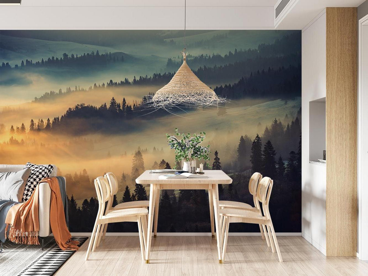 Verwandeln Sie Ihren Raum mit diesem panoramischen Waldwandbild, das die Ruhe der Natur ins Innere bringt. Die neblige Bergtapete schafft ein intensives Erlebnis, perfekt für Räume, in denen Sie Ruhe und Besinnung fördern möchten. Ob im Büro, Wohnzimmer oder Schlafzimmer installiert, verleiht dieses Design Dimension und natürliche Gelassenheit und bewahrt dabei eine anspruchsvolle Ästhetik, die moderne Einrichtungsstile ergänzt.