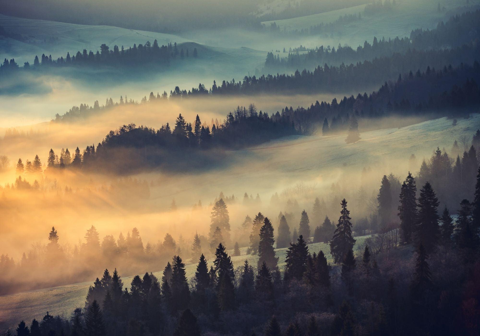 Die neblige Szene funktioniert perfekt als moderner Naturhintergrund für Ihren Alltag.