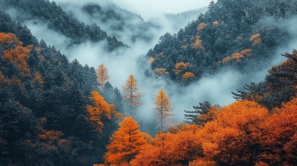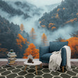 Verwandeln Sie Ihren Raum mit diesem Herbstwald-Wandbild, das die Ruhe der Bergwildnis ins Innere bringt. Die neblige Berglandschaft schafft eine immersive Atmosphäre, die sowohl in intimen als auch offenen Räumen wunderbar wirkt und ein Fenster zu einem friedlichen natürlichen Rückzugsort bietet. Die raffinierte Farbpalette aus Orange- und Türkistönen bietet eine perfekte Grundlage für zeitgenössisches Innendesign und bewahrt gleichzeitig die Verbindung zur natürlichen Welt.