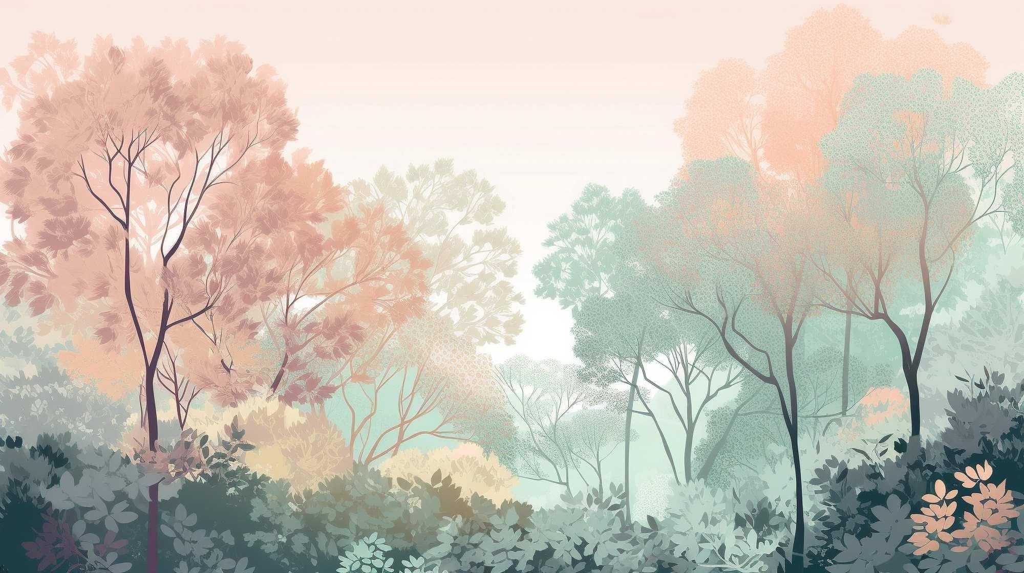Dieses Waldtapeten-Mural schafft mit seiner zarten Mischung aus sanftrosa und minzgrünen Bäumen vor einem nebligen Hintergrund eine bezaubernde Atmosphäre. Das Aquarell-Stil-Laubwerk erzeugt Tiefenschichten, während die anmutigen Äste sich elegant nach oben strecken. Die pastellfarbene Baumtapete verbindet sanfte Farben mit künstlerischen Pinselstrichen und bietet eine anspruchsvolle Interpretation einer Waldszene.