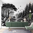 Dieses schwarz-weiße Waldmural verwandelt Wände in Fenster zur Natur.