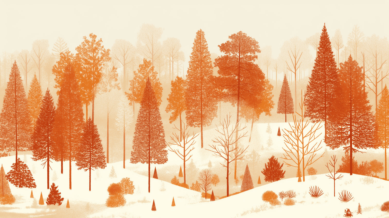Dieses Waldtapeten-Mural zeigt eine faszinierende Landschaft mit hoch aufragenden Kiefern, dargestellt in warmen Terrakottatönen vor einem sanften beigen Hintergrund. Die Silhouetten majestätischer Nadelbäume schaffen ein rhythmisches Muster, das die ruhige Schönheit eines nebligen Waldes bei Tagesanbruch einfängt. Jeder Baum ist sorgfältig detailliert, von den hohen immergrünen Bäumen bis zu den zarten kahlen Ästen, und schafft eine Kieferntapete, die natürliche Eleganz und künstlerische Raffinesse verkörpert.