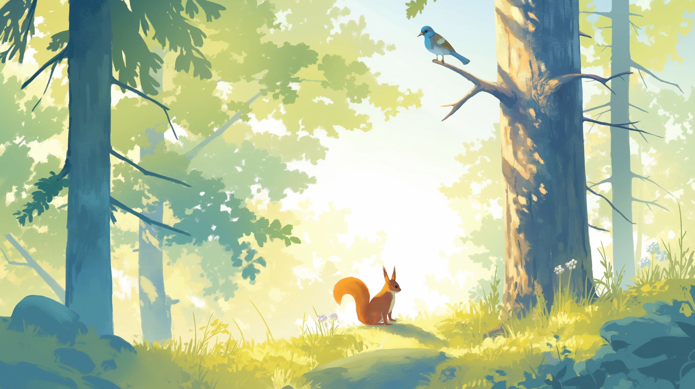 Diese Waldtier-Tapete fängt eine bezaubernde Waldszene ein, die im ätherischen Morgenlicht erstrahlt. Ein lebhafter oranger Eichhörnchen und ein azurblauer Singvogel bewohnen diese ruhige Umgebung, in der majestätische Baumstämme gegen ein sanft-grünes Blätterdach emporragen. Das Waldmural-Design balanciert meisterhaft warmes goldenes Sonnenlicht, das durch die Blätter filtert, mit kühlen blauen Schatten und schafft eine Tiefe, die das Auge in die magische Waldszene zieht.