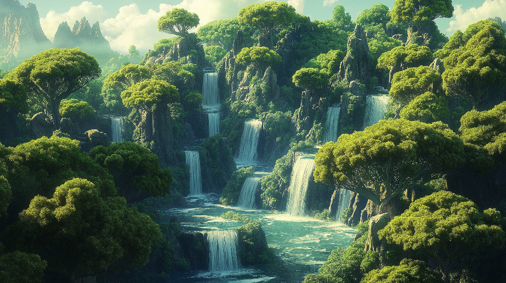 Diese Wasserfall-Landschaftstapete fängt die rohe Schönheit eines verborgenen Paradieses ein, in dem herabstürzende Wasser auf üppige Klippen treffen. Mehrere kristallklare Wasserfälle stürzen anmutig durch hoch aufragende Felsformationen, während üppige grüne Baumkronen ein faszinierendes natürliches Amphitheater schaffen. Das Waldwasserfall-Mural zeigt die perfekte Harmonie zwischen fließendem Wasser und blühender Vegetation, gemalt in satten Smaragdgrüntönen vor einem verträumten Himmel.