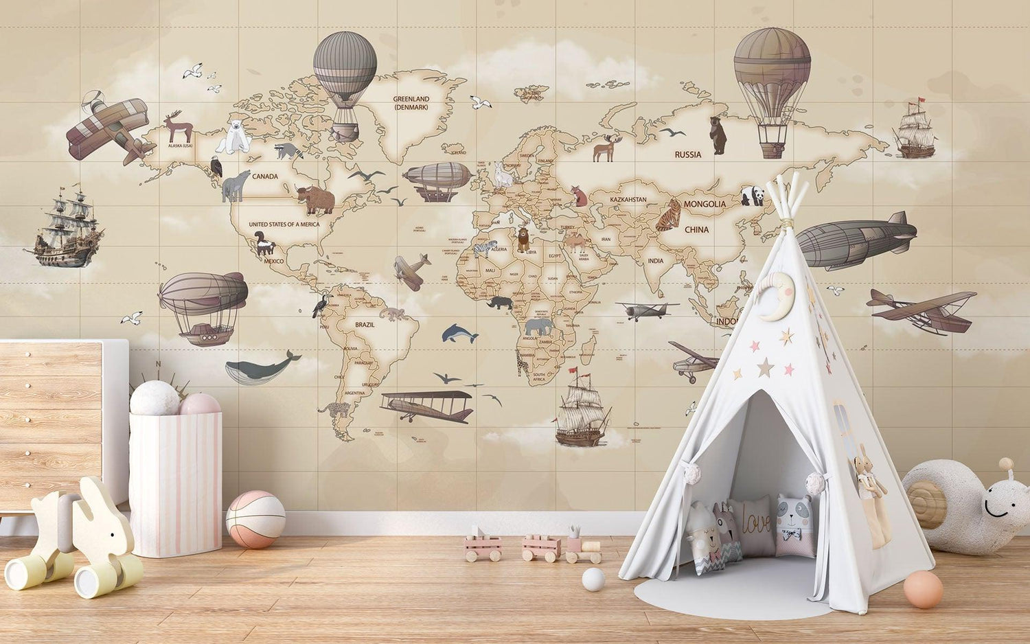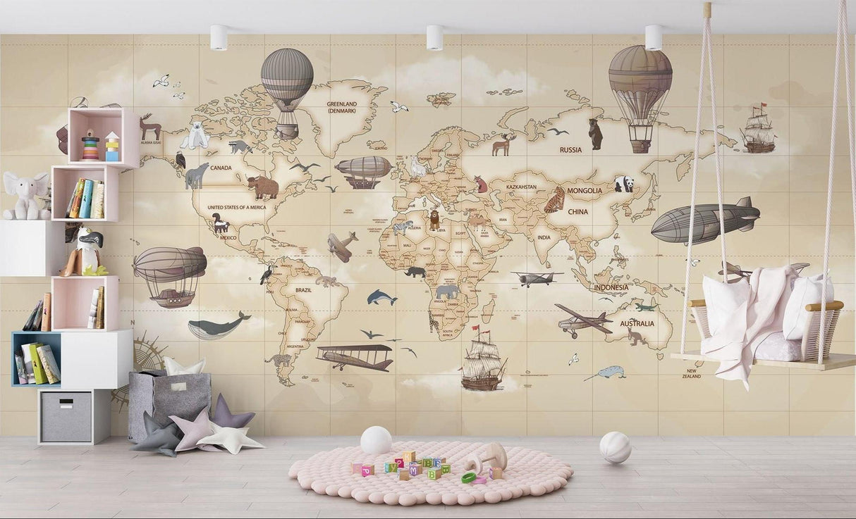 Diese bezaubernde Weltkarten-Tapete entfaltet eine fesselnde Erzählung globaler Erkundung durch sanfte Beigetöne und sorgfältig detaillierte Illustrationen. Vintage-Heißluftballons schweben anmutig über Kontinente, während klassische Luftschiffe und Segelschiffe die Ecken dieser Abenteuerkarten-Wandmalerei durchqueren. Charmante Tierillustrationen bevölkern ihre heimischen Regionen, von Pandas in Asien bis zu Elefanten in Afrika, und schaffen eine lehrreiche und zugleich verspielte visuelle Reise.