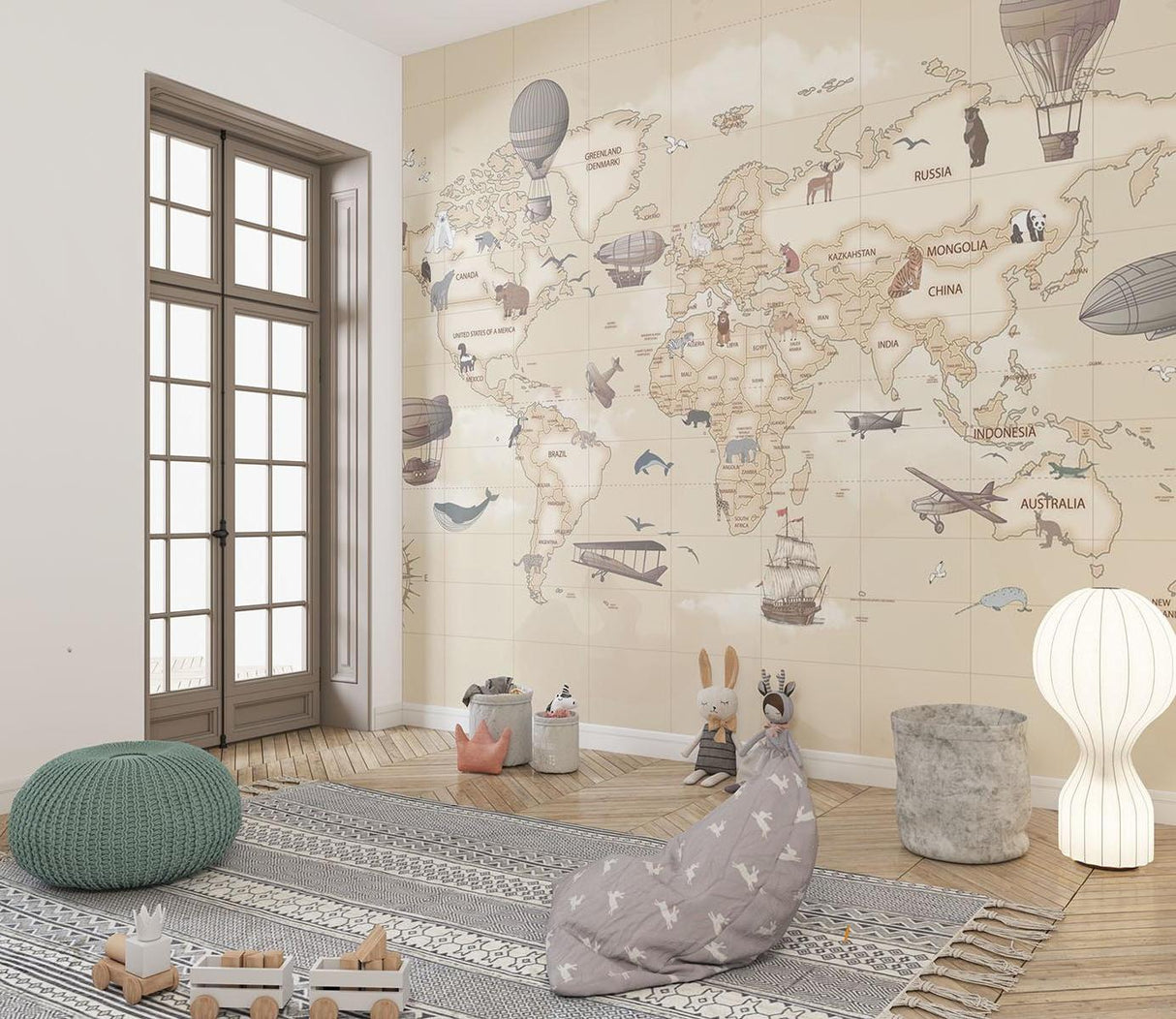 Verwandeln Sie jeden Raum in ein Reich der Entdeckung mit dieser vintage Weltkarten-Tapete. Die neutrale Farbpalette sorgt für Vielseitigkeit, während das Abenteuer-Themen-Wandbild Neugier und Fantasie weckt. Perfekt, um eine inspirierende Atmosphäre in Kinderzimmern, Kinderkrippen oder Spielzimmern zu schaffen, verbindet dieses Design pädagogischen Wert mit zeitlosem ästhetischem Reiz, der mit Ihrem Kind mitwächst.