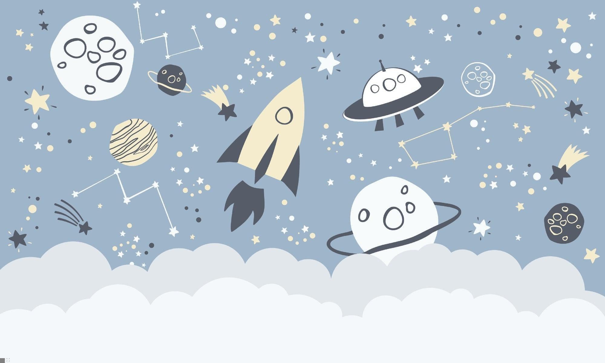 Diese bezaubernde Weltraum-Themen-Tapete schafft einen magischen kosmischen Spielplatz, auf dem die Fantasie abhebt. Vor einem ruhigen blau-grauen Hintergrund tanzen verspielte UFOs, elegante Raketen und leuchtende Planeten zwischen funkelnden Sternen und Sternbildern. Flauschige weiße Wolken schweben unter der himmlischen Szene, während cremefarbene und marineblaue Akzente dieser Galaxie-Tapete eine raffinierte Tiefe verleihen.