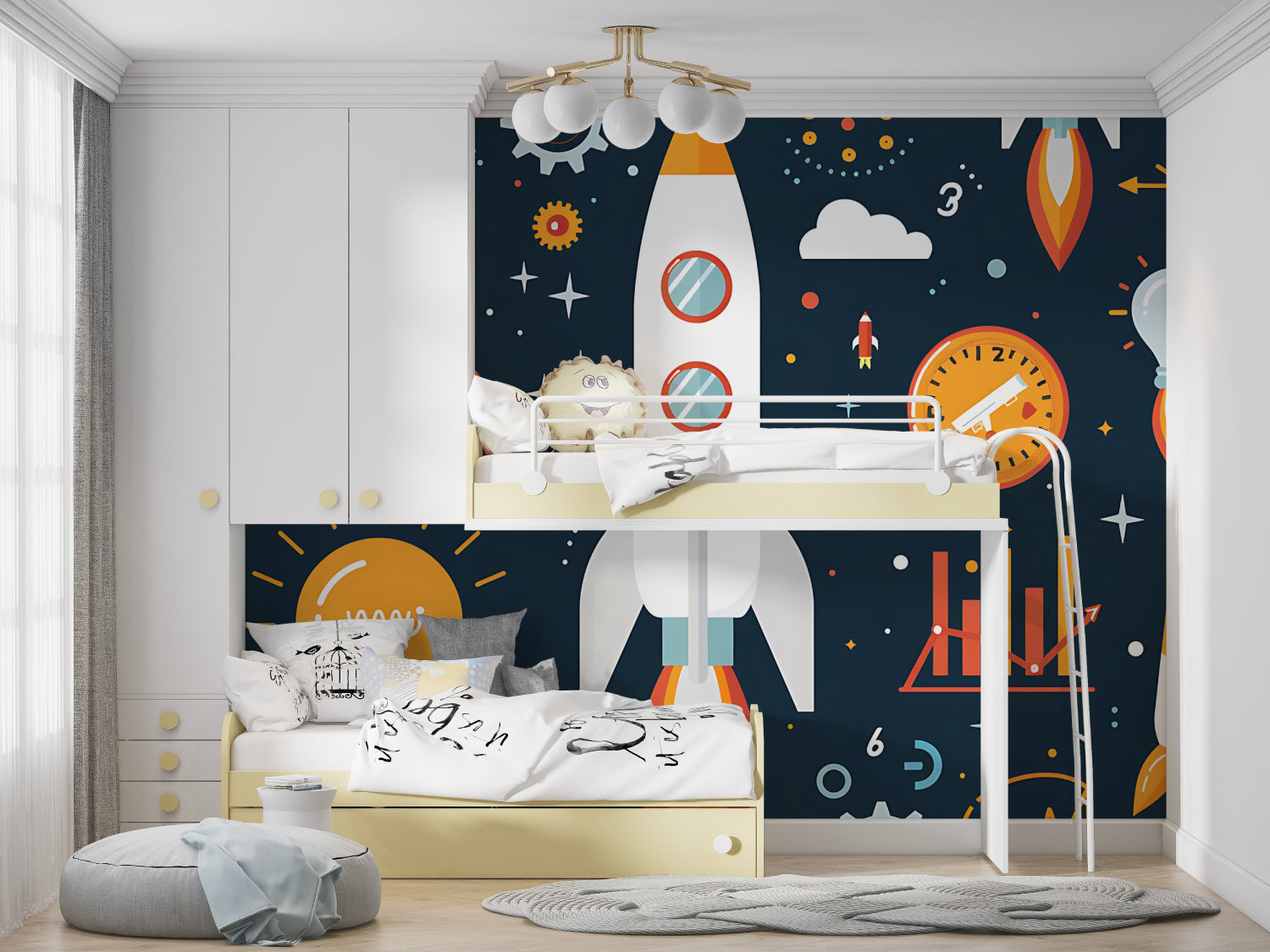 Diese Weltraumraketen-Tapete verwandelt Wände in Tore zum Abenteuer.
