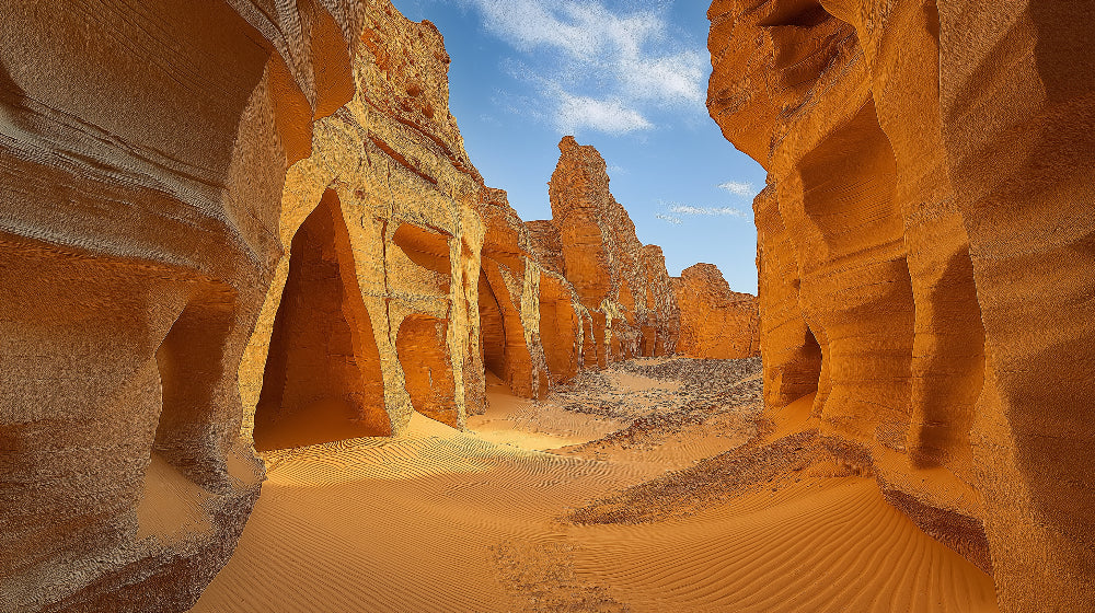Diese Wüsten-Canyon-Tapete fängt die rohe Schönheit der dramatischsten Landschaften der Natur ein. Hohe Sandsteinformationen in satten gold-orangefarbenen Tönen schaffen einen faszinierenden Korridor durch uralte Felsformationen. Das Zusammenspiel von Licht und Schatten an den verwitterten Canyonwänden offenbart filigrane Strukturen, während sich wellenförmige Sanddünen zu einem makellosen Wüstenhimmel in einem endlosen Tanz von Erde und Atmosphäre erstrecken.
