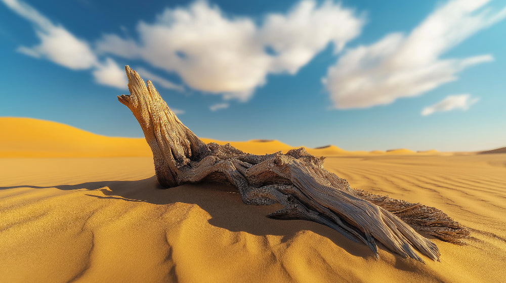 Diese Wüstenlandschaft Tapete fängt eine faszinierende Szene ein, in der verwittertes Treibholz gegen endlose goldene Dünen lehnt. Die Komposition zeigt die Kunst der Natur durch das Zusammenspiel von Texturen, vom rauen, sonnengebleichten Holzmaserung bis zu den glatten, wellenförmigen Sandwellen. Vor einem lebhaften azurblauen Himmel treiben baumwollweiße Wolken träge dahin und schaffen ein Wüstenwandbild, das von Einsamkeit und zeitloser Schönheit erzählt.