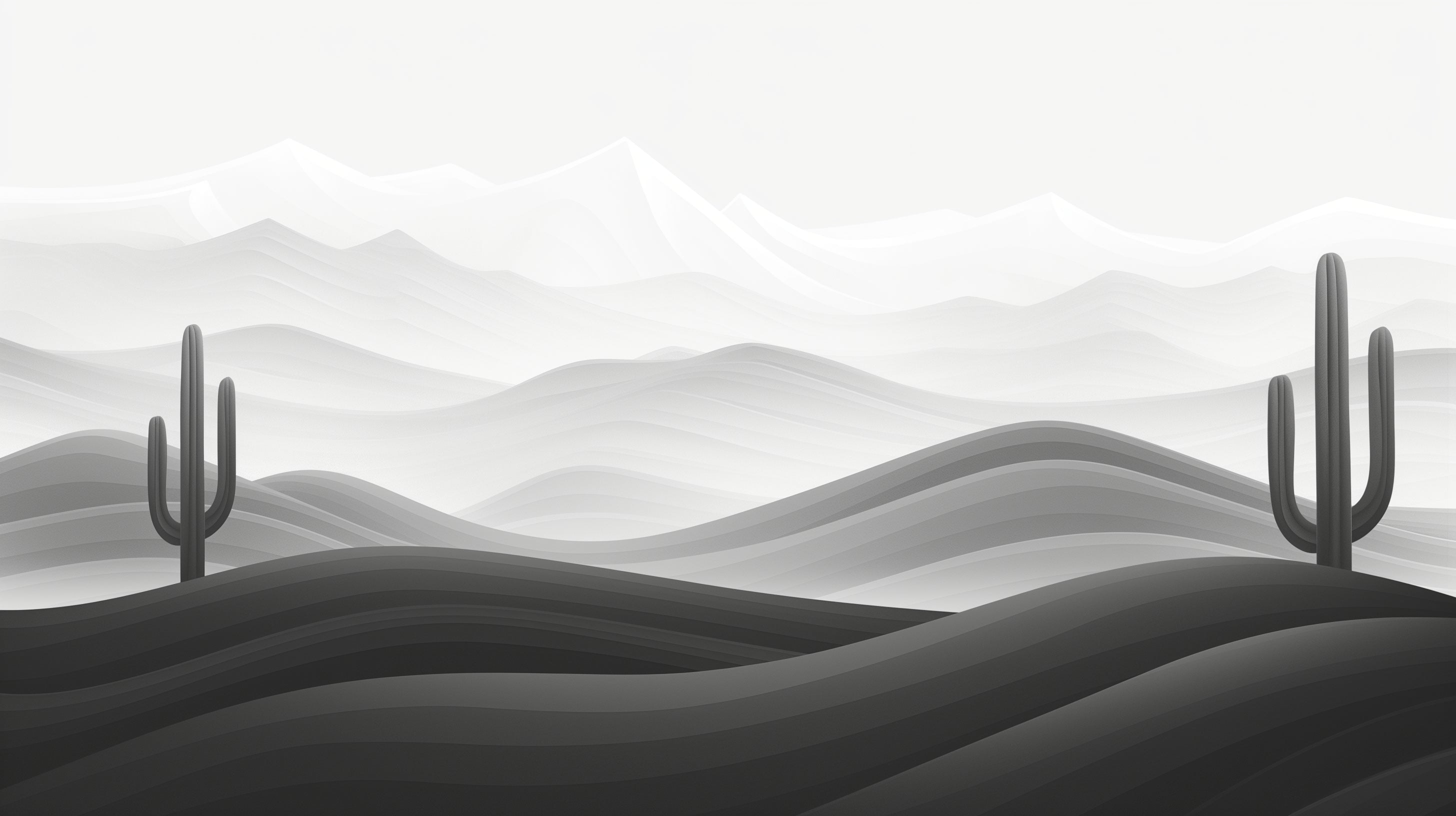 Diese Wüstenlandschaft Tapete fängt die Essenz minimalistischer Schönheit durch ein meisterhaftes Spiel monochromatischer Töne ein. Die wellenförmigen Dünen erzeugen einen faszinierenden Rhythmus im Design, während einsame Kaktussilhouetten als mutige Wächter vor dem nebligen Bergpanorama stehen. Die sorgfältige Abstufung der Grautöne schafft eine ätherische Tiefe und verwandelt eine einfache Wüstenszene in eine künstlerische Meditation über Form und Schatten.