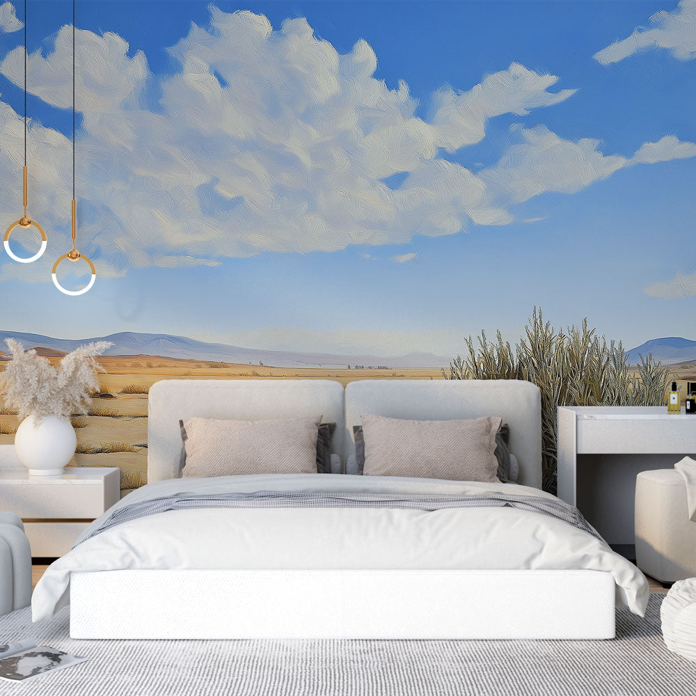Diese Wüstenlandschaft Tapete fängt die rohe Schönheit einer trockenen Wildnis unter einem weiten Himmel ein. Die Komposition balanciert meisterhaft die goldfarbenen Wüstenebenen mit majestätischen Bergsilhouetten in der Ferne, während salbeigrüner Wüstenbewuchs einen natürlichen Kontrast zur Szene hinzufügt. Die Wüstenlandschaft Tapete wird von einer dramatischen Darstellung aufgewölbter weißer Wolken vor einem lebhaften blauen Himmel gekrönt, die ein Gefühl von grenzenlosem Raum und Ruhe schafft.