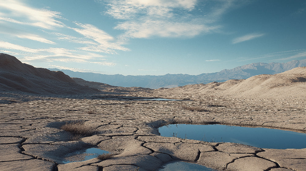 Diese Wüstenlandschaft Tapete fängt die rohe Schönheit einer trockenen Wildnis ein, in der raue Berge auf ruhige blaue Gewässer treffen. Das dramatische Panorama zeigt Muster rissiger Erde, die sich zu fernen Gipfeln erstrecken, während kristallklare Pools den azurblauen Himmel darüber spiegeln. Die neutrale Farbpalette sonnengebleichter Erdtöne kontrastiert mit dem Gebirgslandschaft Tapeten Hintergrund und schafft eine Komposition, die von der Fähigkeit der Natur spricht, Harmonie in Extremen zu finden.