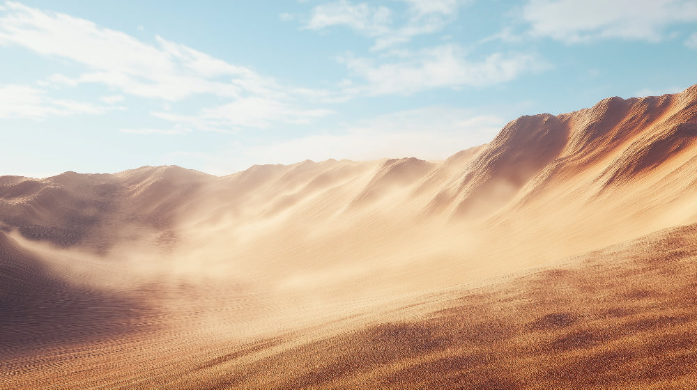 Diese Wüstenlandschaft Tapete fängt die faszinierende Schönheit endloser Sanddünen ein, die sich bis zum Horizont erstrecken. Die warm-beigen Sandwellen erzeugen einen natürlichen Ombre-Effekt, der von satten Terrakottatönen zu sanften goldenen Nuancen übergeht. Vor dieser skulpturalen Landschaft entfaltet sich eine ruhige Wüstentapete Szene unter einem azurblauen Himmel mit zarten Wolken, die eine Komposition schafft, die Wärme und Gelassenheit ausbalanciert.