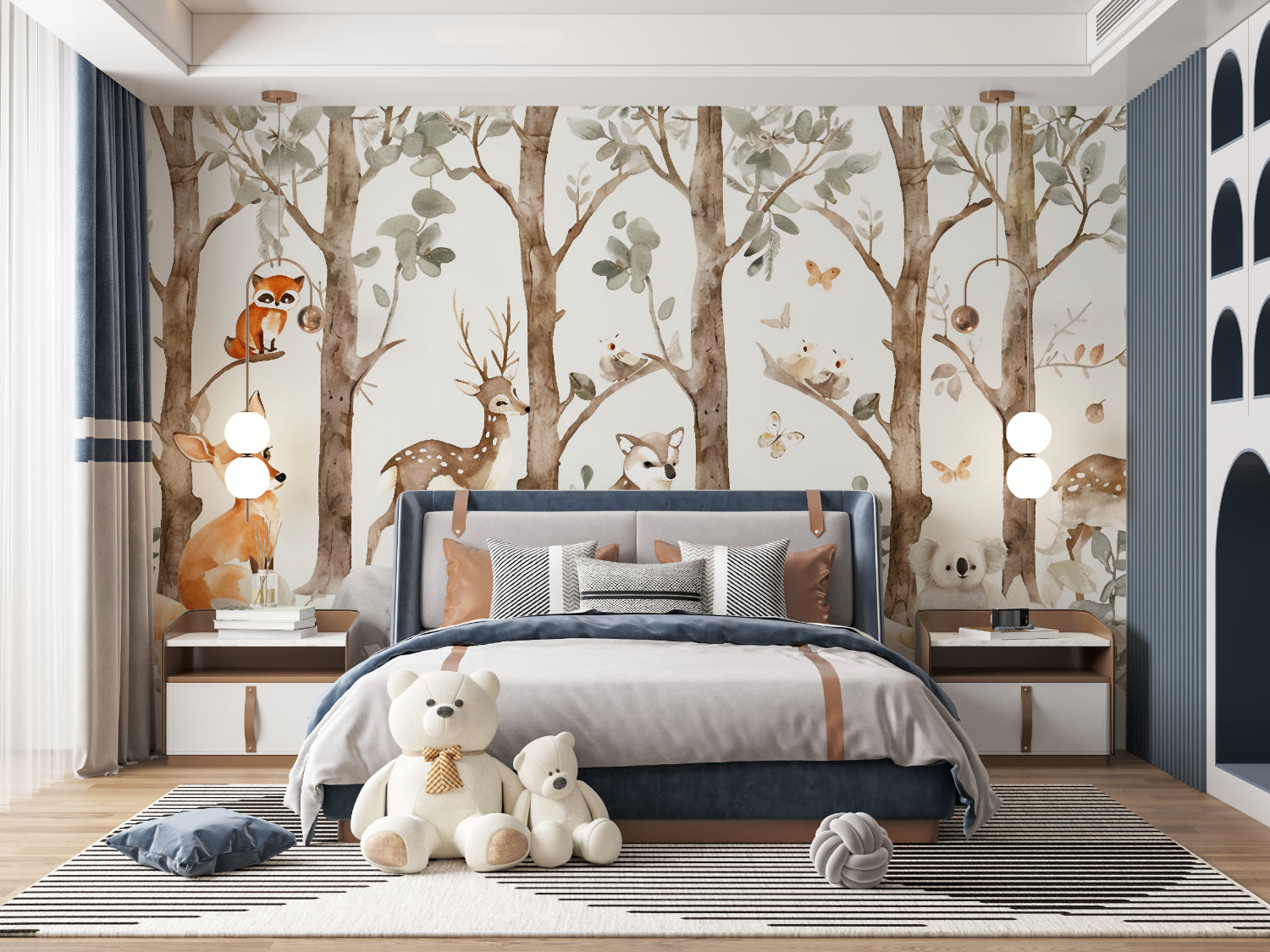 The soft watercolor design makes this kids woodland mural feel extra special.