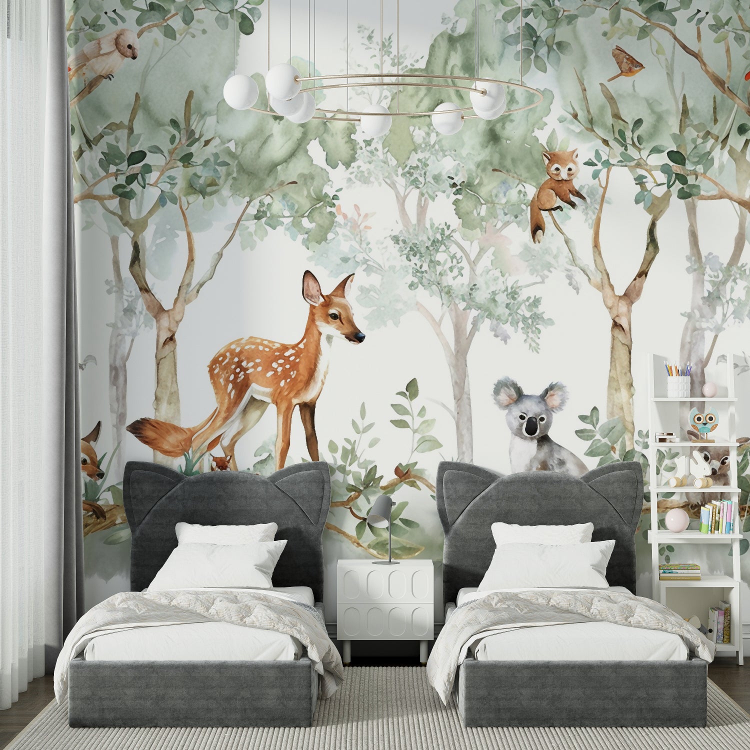 Papel Pintado Mural de Animales del Bosque | Vida Silvestre en Acuarela con Ciervo y Koala
