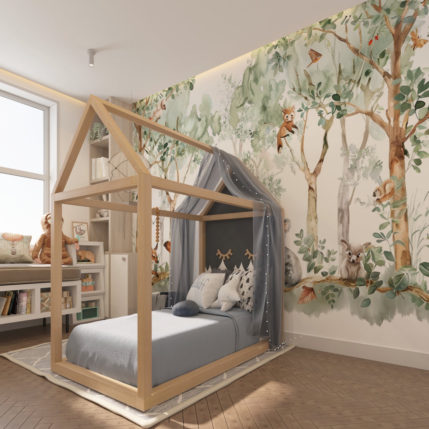 The gentle green shades and cute animals make this woodland wallpaper perfect for quiet moments.