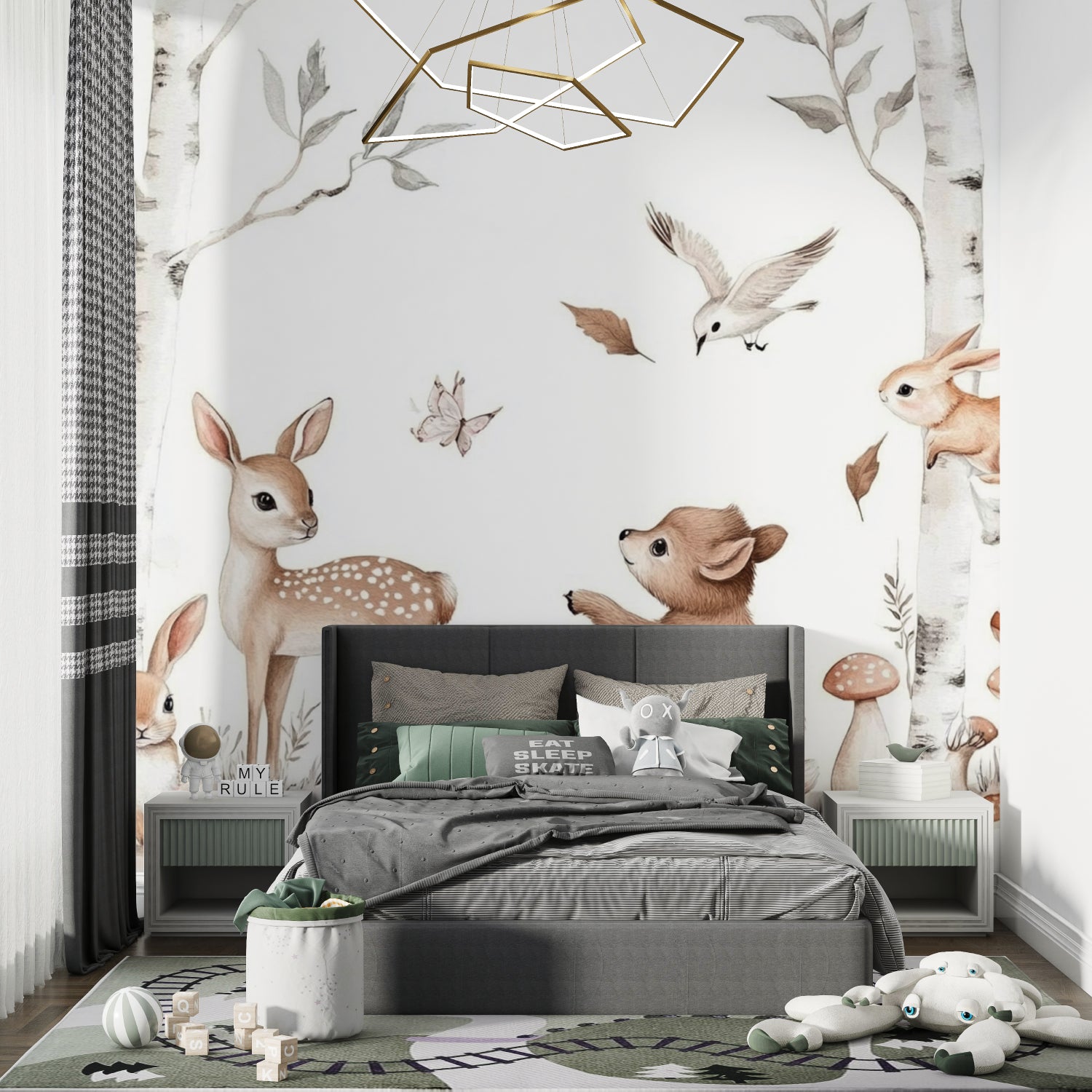 Sweet forest creatures and birch trees create a gentle, dreamy space perfect for young minds.