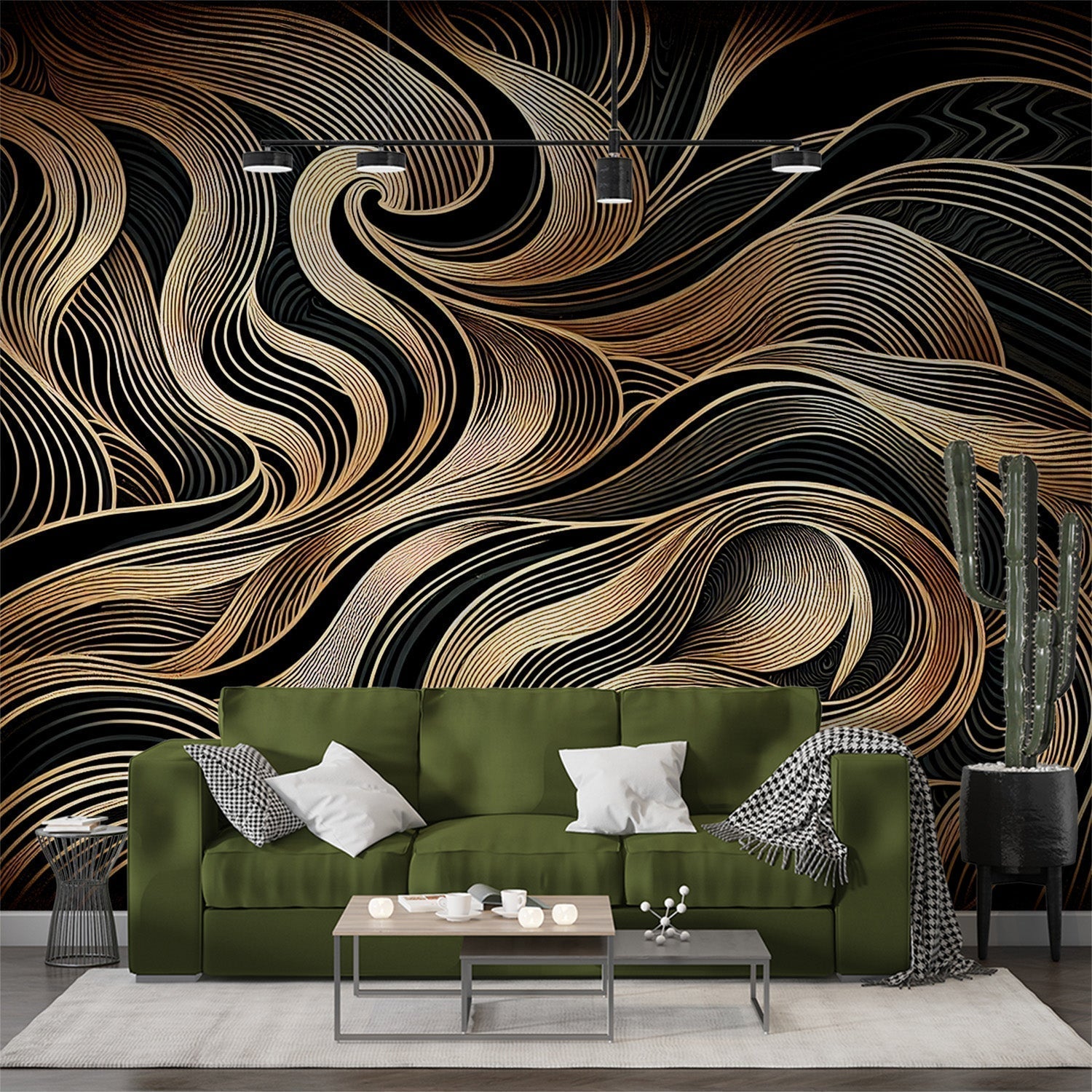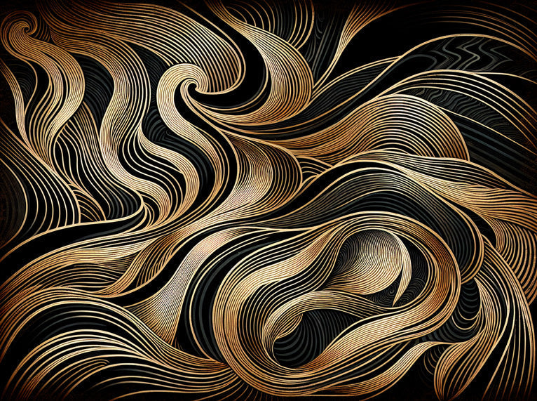 Este papel mural art déco presenta una exhibición hipnotizante de líneas doradas fluidas que bailan sobre un fondo negro profundo. El patrón sofisticado presenta olas y remolinos meticulosamente detallados, representados en tonos metálicos dorados lustrosos y bronce cálido. Cada línea curva fluye con precisión elegante, creando un papel tapiz abstracto dorado que encarna la cúspide del lujo moderno y la expresión artística.