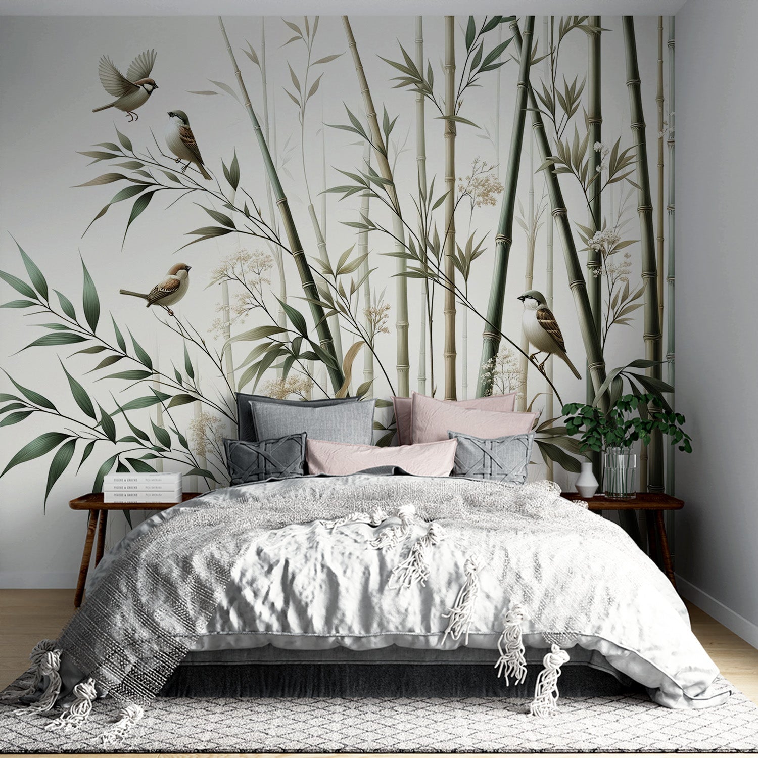 Papel Pintado Mural de Bambú | Jardín Asiático con Diseño de Pájaros